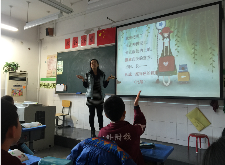 高爽老师执教《我想》一课,课前备课组老师多次讨论研究,寻找读写结合点,设计教学环节。课堂教学中教师声情并茂地朗读和描述使学生不知不觉地进入诗歌的意境,在听赏中获得初步的情感体验。教师从学生已有的知识经验出发,创设丰富多彩的听、说、读、演等一系列活动,孩子们在活动中发散思维,联系生活经验展开大胆的想象,教师不失时机地对学生进行读写的指导,将训练真正落到实处,提高了学生的读写能力。