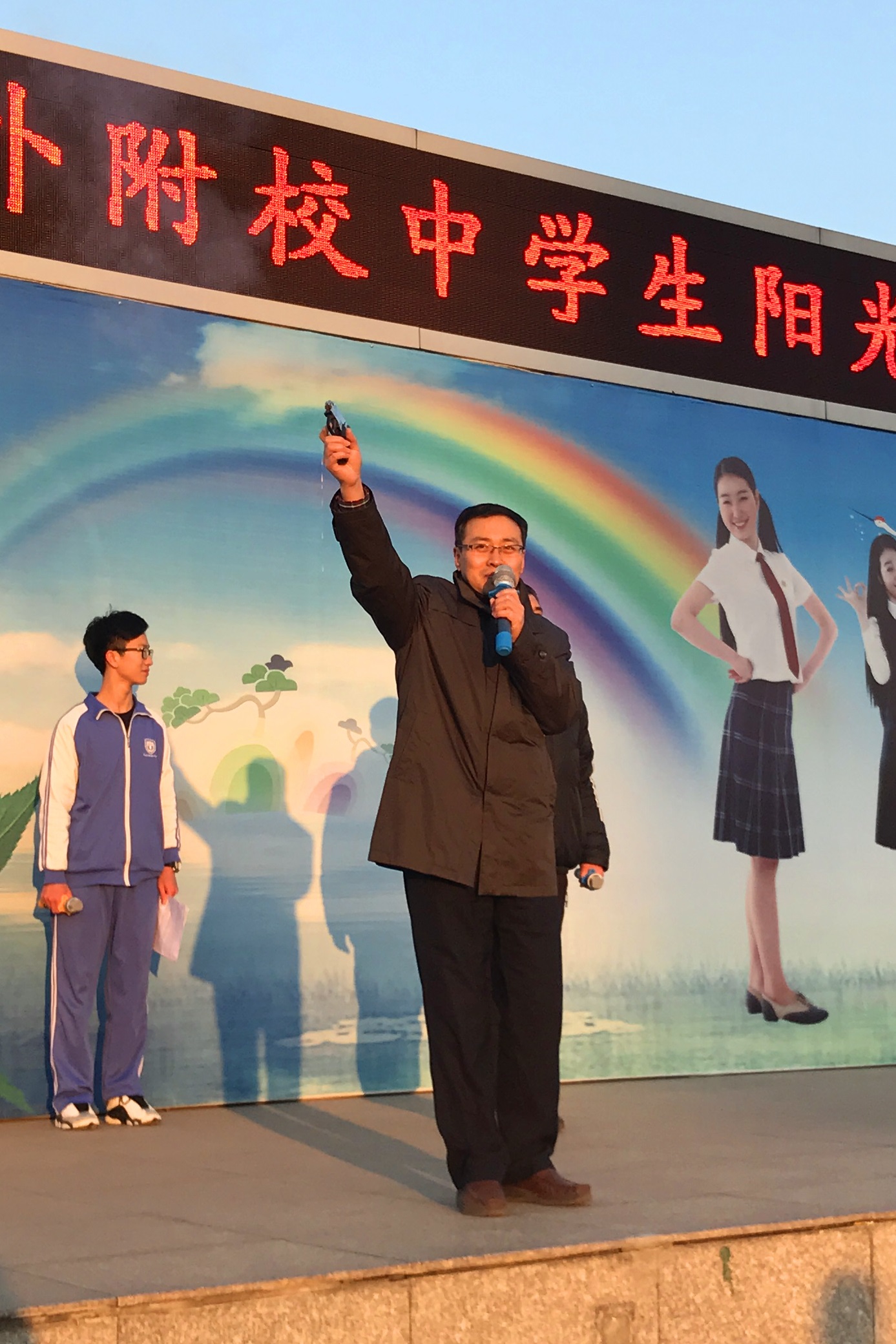 11月28日,我校举行2016-2017学年阳光体育冬季长跑启动仪式暨中学生第14周升旗仪式。本周升旗手和国歌领唱的班级是高一(6)班,双语主持是来自高中的杨子涵和艾晓燕同学。