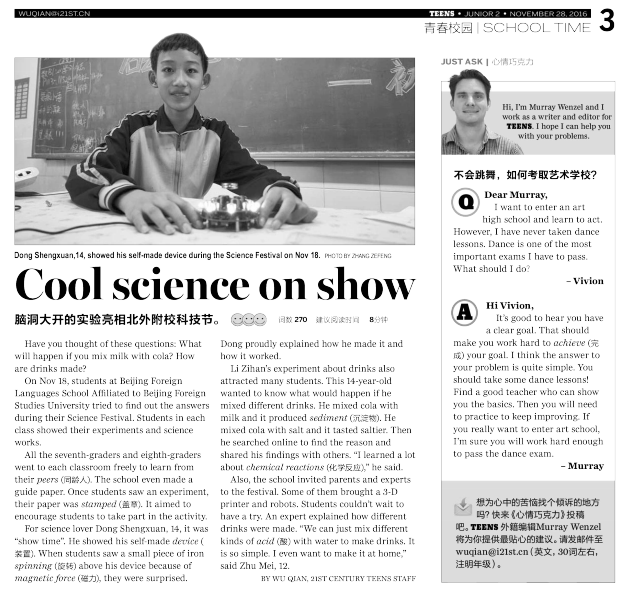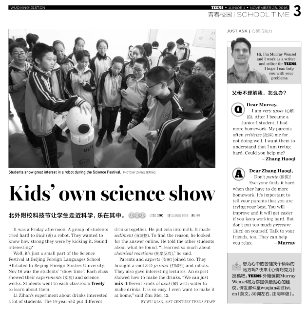 中国日报社《二十一世纪学生英文报》2016—2017学年第14期,总第561期,第3版:青春校园栏目刊登我校初中科技嘉年华活动。