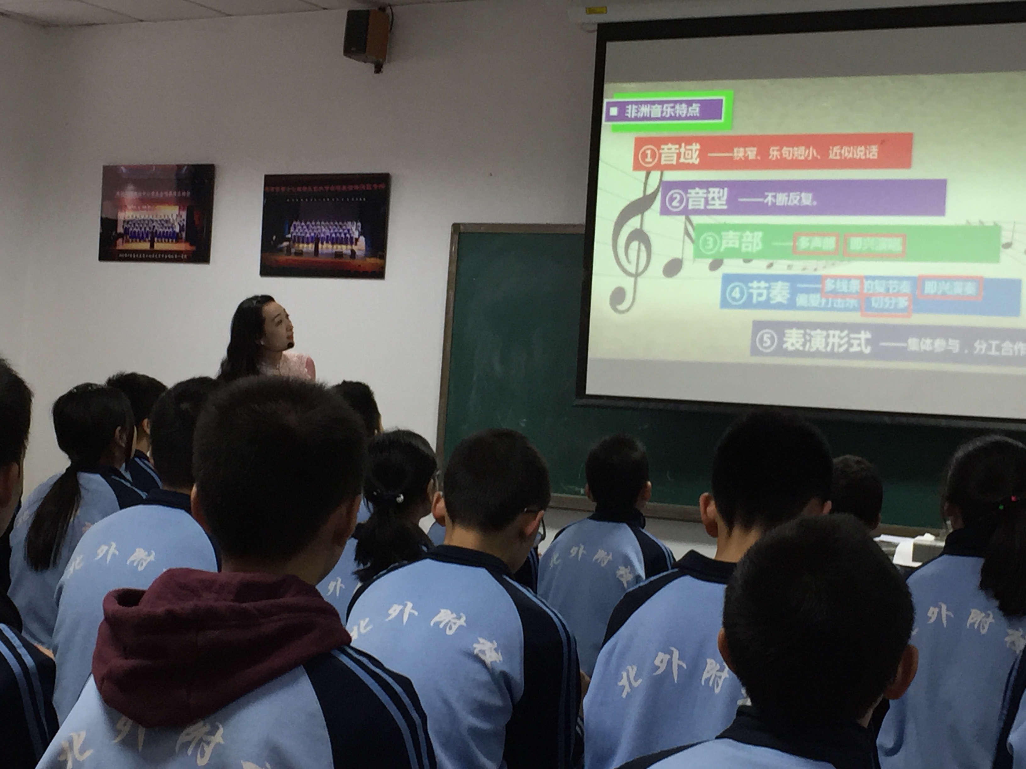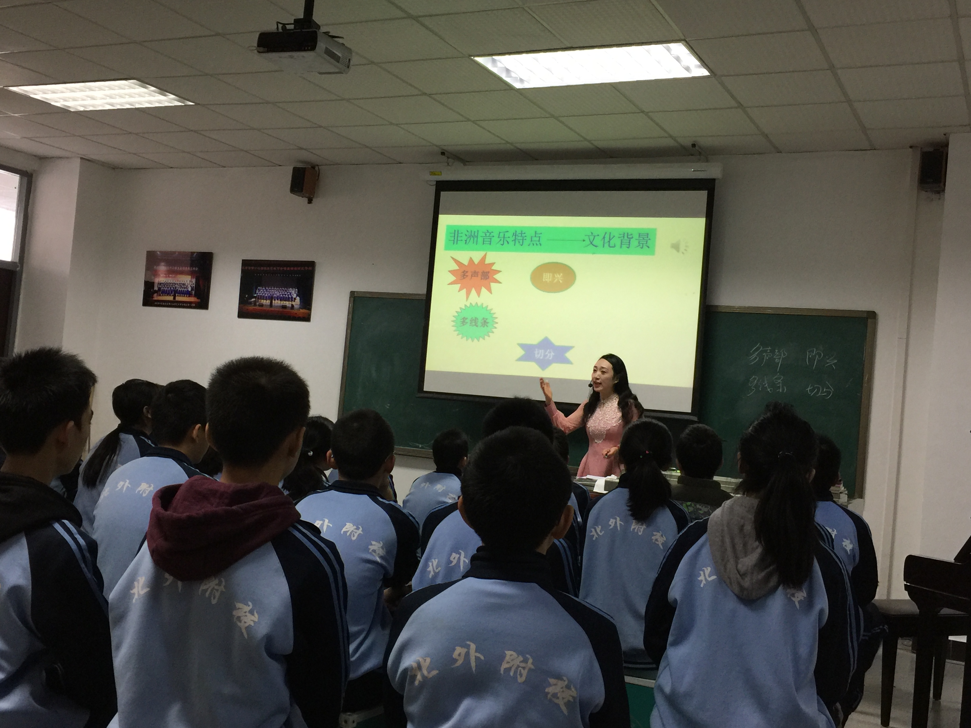 黄丽娜老师的课题为《探寻动感的非洲音乐》。以开阔的视野学习世界其他国家的音乐文化,理解音乐文化的多样性。”为指导思想。纵观整节课的设计,从欣赏音乐到多声部的学唱与配合再到即兴创编节奏,体现了循序渐进的设计理念。这种学习方式更易于初二的孩子接受。在教学中,老师运用了奥尔夫的声势教学法来引导学生体验非洲的切分节奏。在学习中,注重让学生去记忆、模仿旋律和节奏,锻炼他们听、记能力。通过身体律动和参与表演,学生们对非洲音乐的特点有了更直观的感受和深刻的体会。尤其在即兴节奏创编的环节,学生们主动思考,勇于表现,展现了学生们的创造力。生动的课堂,流畅的教学环节,得到了教研员的表扬。