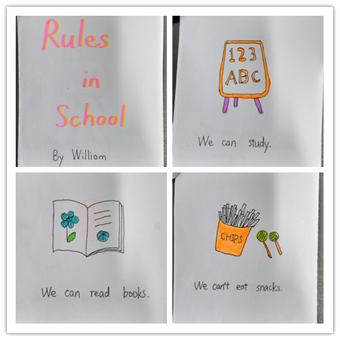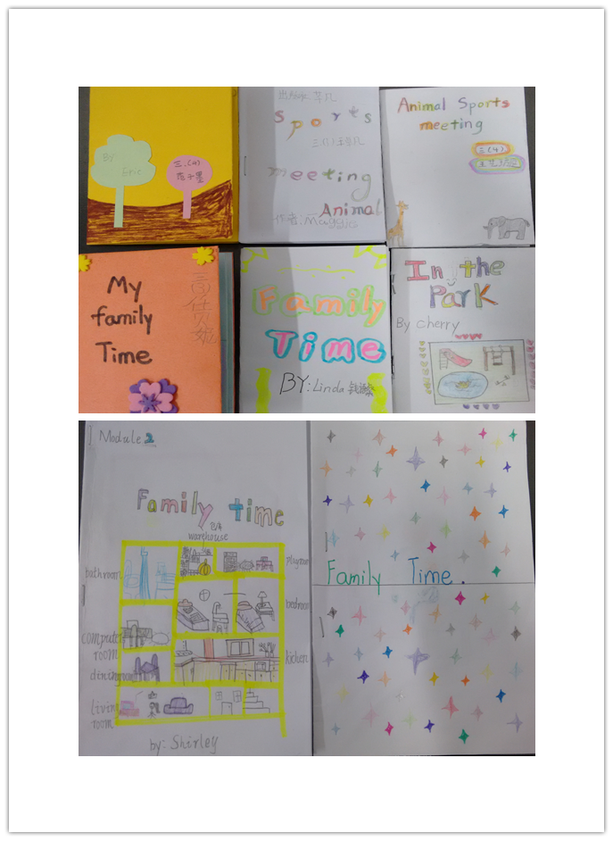 三年级的同学们以外研社新标准课本剧为蓝本,根据老师的指导,完成了5个主题的绘本创作。