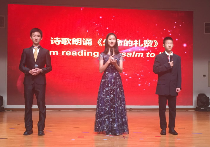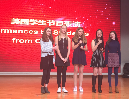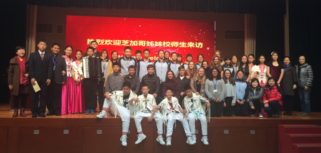 在表演环节中,我校学生精心准备了具有中国传统文化特色的古筝合奏《春苗》、极具民族风的手风琴独奏《傣家欢乐泼水节》、英文诗歌朗诵《生命的礼赞》,初一街舞团还为大家带来了青春感十足的街舞表演,将欢迎会推向了高潮。芝加哥姊妹校的学生为大家准备了合唱表演《吉祥三宝》、《you and me》以及《you raise me up》,耳熟能详的歌曲引发了大家合唱的共鸣,现场气氛十分热烈。
