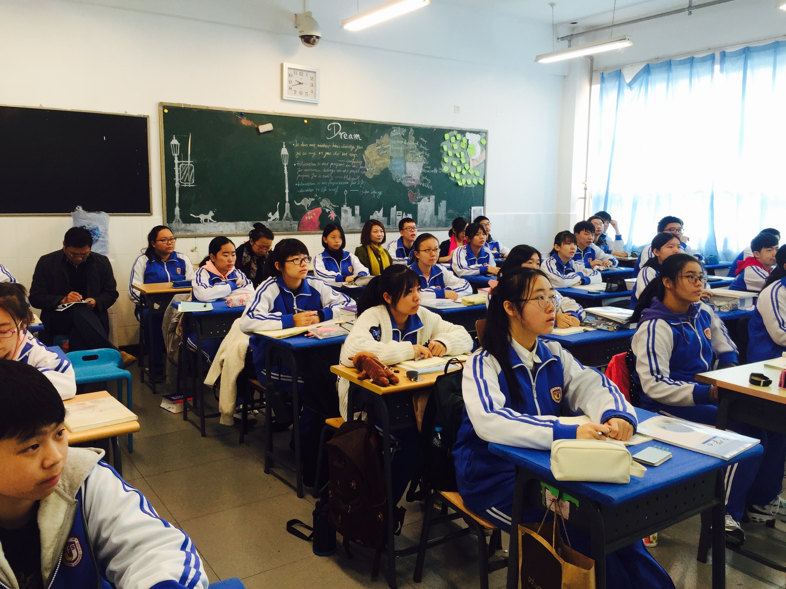 11月4日上午,清河学区主任、数学特级教师许忠领莅临我校指导高中校区教学工作,并与高中数学教师进行了深入的座谈交流。整个活动分为两部分内容:听课和座谈。听课分别在上午第三节课在高一(6)班听了杨秋芳老师的《角的概念的推广》一课,第四节课听了高三李妍老师的理科班复习课《数列的应用》。听完两节课后,许忠领在主教楼209与全体高中数学组教师进行了深入交流与沟通。在交流点评中,许忠领以十三五数学研究专题——数学课堂情境引入为切入点,分别对两节课进行了点评,提出了具体的指导意见。