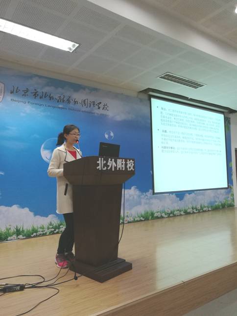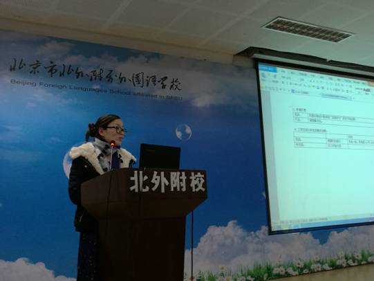 首先是英语组的汇报。英语教研组组长刘娟老师介绍了本学期三个海淀区十三五区级课题研究进展,并重点汇报了初二备课组的“初中英语课堂听说策略研究”的研究情况,在海淀区骨干教师张霞老师的带领下,以李广智等老师为核心成员,结合一师一优课活动,对每位老师的课堂,进行集体备课、集体反思。经过这样的课例研究,快速提升了老师们对“听说课”的教学设计能力。找十三五课题的引领下,英语组目前已经形成了人人有课题、人人为课题的研究氛围。