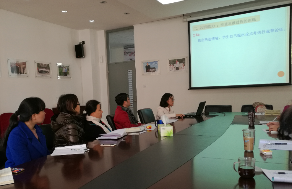 首先发言的是政治组备课组长周琴老师,周老师认为政治学科发展学生的学科能力主要包括共性和个性两个方面,并且重点谈论了个性的三个层面:一是非判断能力;二是思辨能力;三是社会实践能力。是非判断能力有助于培养学生正确的价值观,例如初二学生的交友原则。思辨能力是注重学生思维过程的训练,例如初三学生是要坚持独立自主,自创品牌还是坚持对外开放,全面引进?社会实践能力是培养学生解决生活实际问题的能力。
