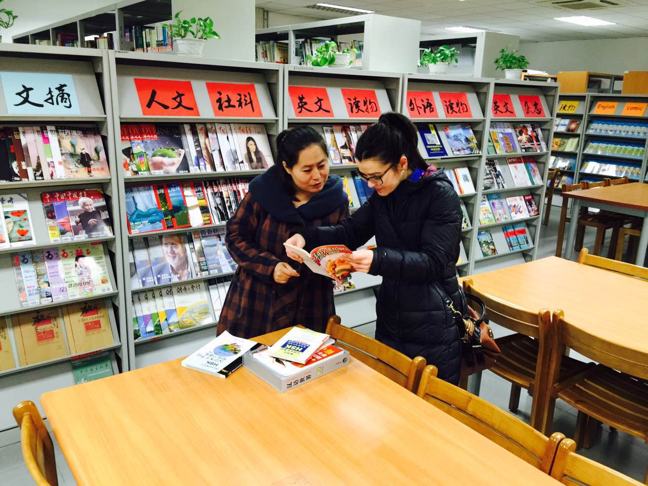 作为一所以外语办学为特色的学校,图书馆的工作中也体现了我校特色。除了日常的报刊、杂志、读物书籍的整理借阅,图书馆针对我校外籍教师提供了英语借阅书籍服务。图书管理员王老师具备过硬的业务能力和很强的英语沟通能力。