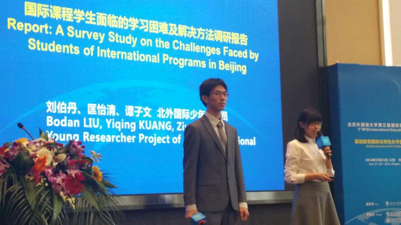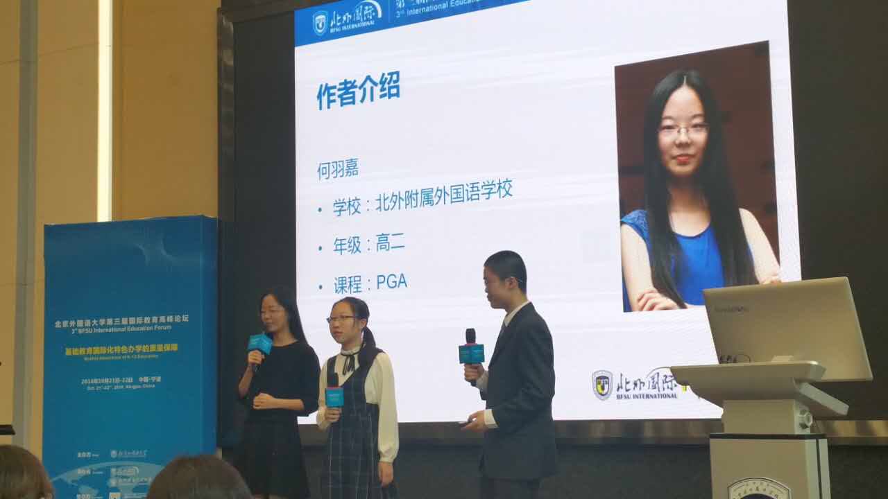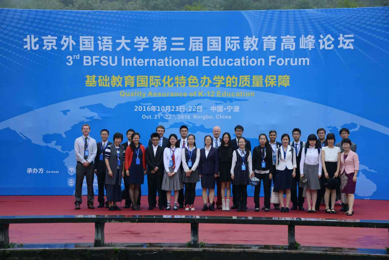 2016年10月21日,北外国际少年研究员们赴宁波参加北京外国语大学第三届国际教育高峰论坛。“少年研究员”项目是由北外国际主导的高中生培养计划,采用导师制,由北外教授指导学生小组开展科研项目。我校高二年级学生李奕,何羽嘉,刘伯丹,刘佳贺作为第一期少年研究员,参与了此次活动。
