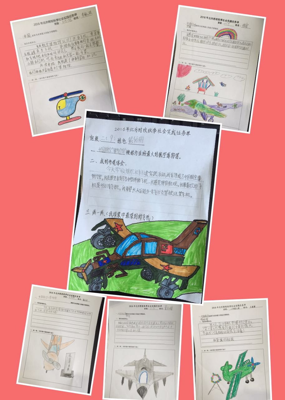 活动后,各班学生学习了关于秋天的歌谣,填写了秋季社会实践任务单。在任务单中,同学们分享了自己的参观体会,并画出了自己印象中最深刻的飞机。