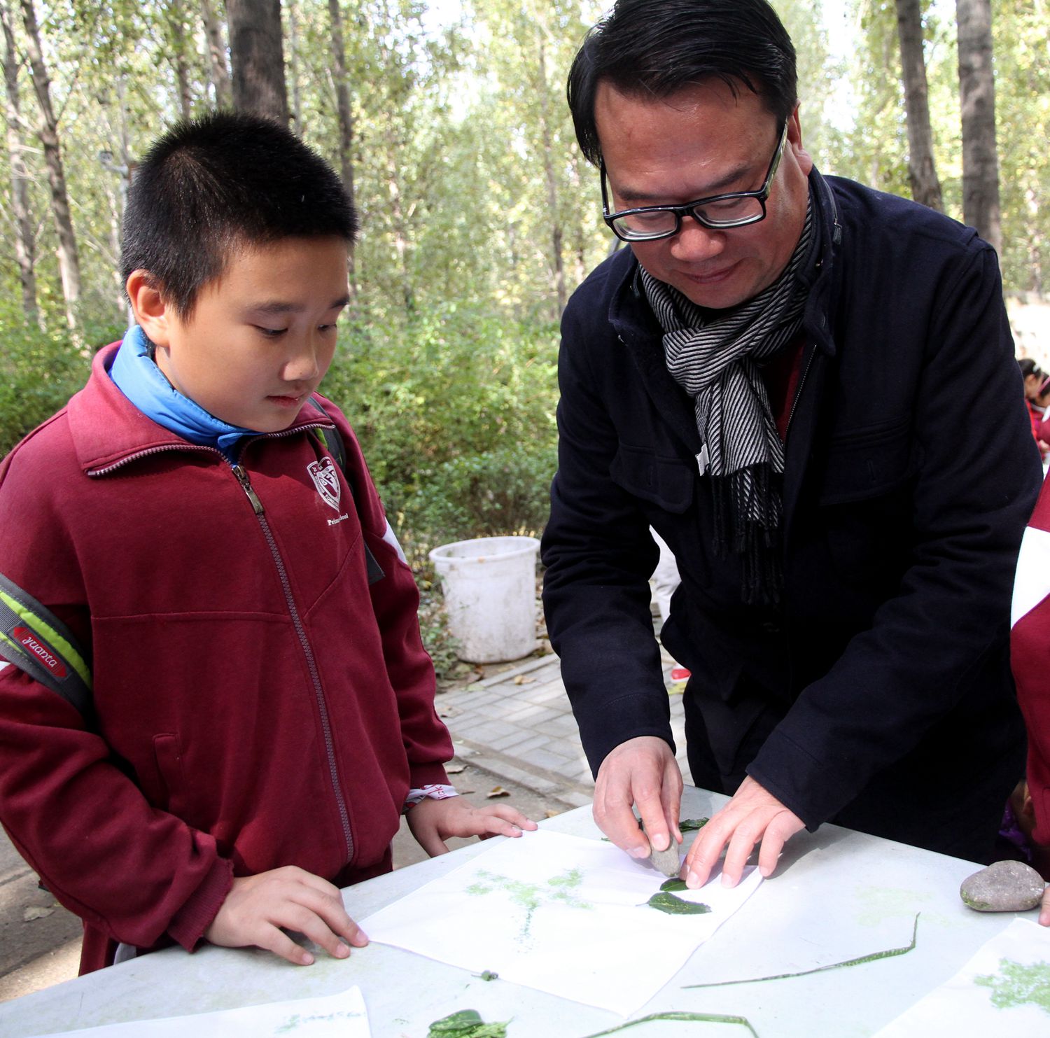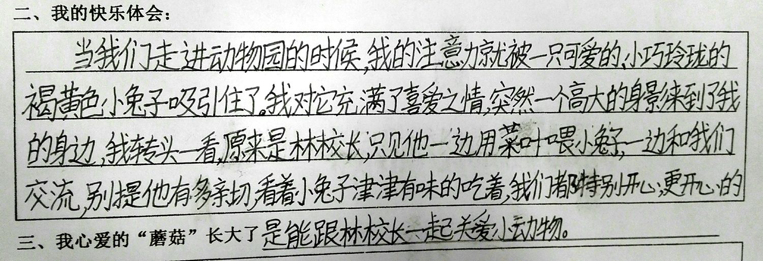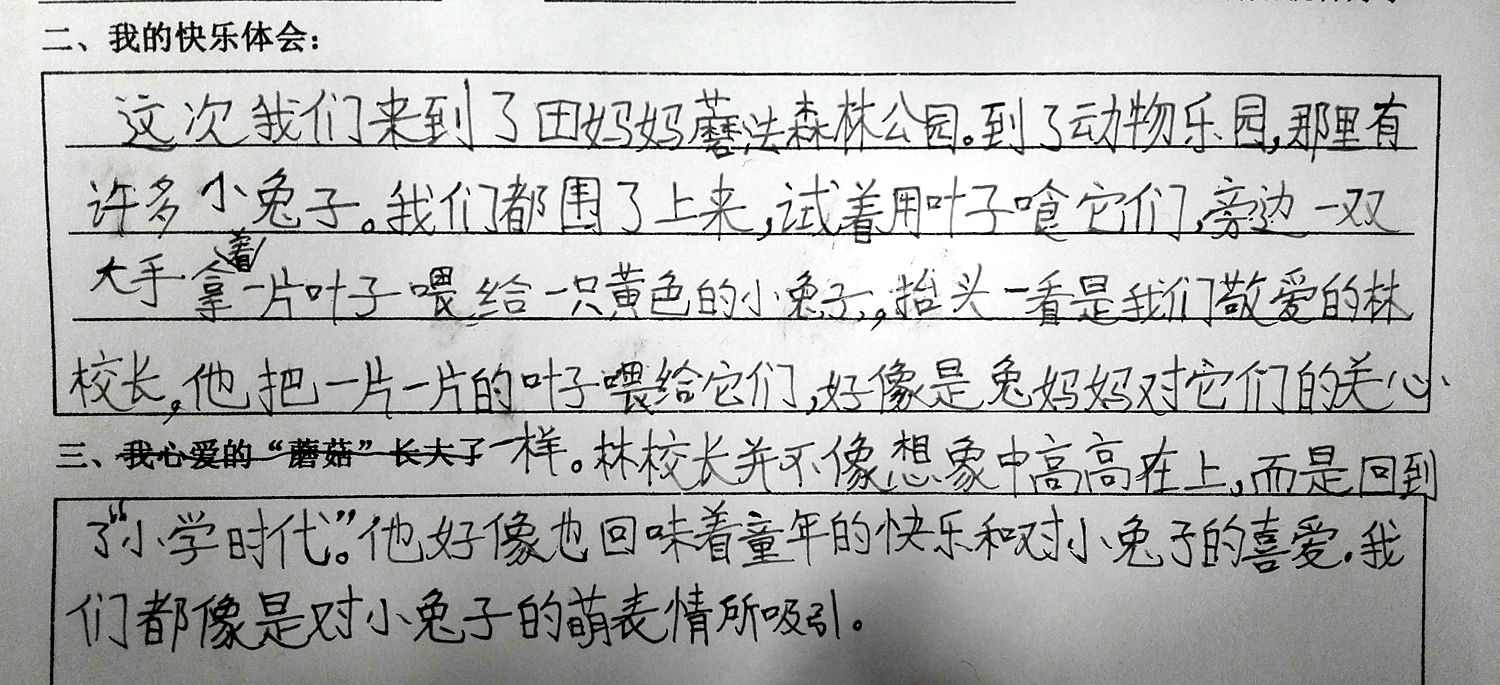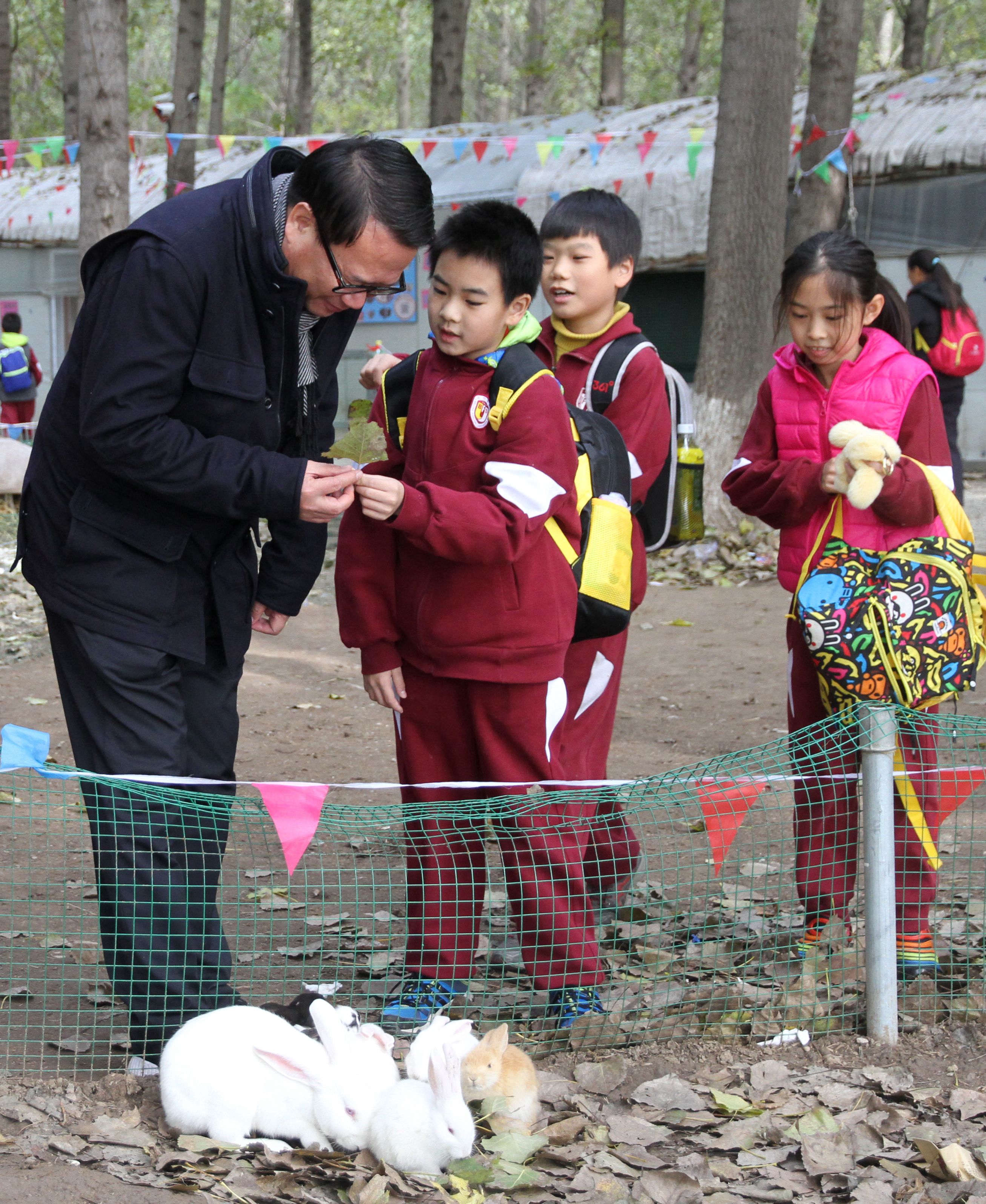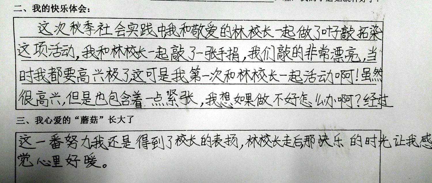 今天,我们来到田妈妈蘑法森林上社会实践活动课,林校长也来到我们中间一起活动。在森林动物园,他拿起菜叶一边逗小兔子,一边和我们交流。在敲拓染实践区,他走到我们身边,跟我们围着一张桌子,认真的用树叶拼好图形,拿起石头使劲的敲击,一边敲击一边还欣赏我们稚嫩的创作。那一刻,他不仅仅是校长,更多的是师长的引领和同伴的欢笑。