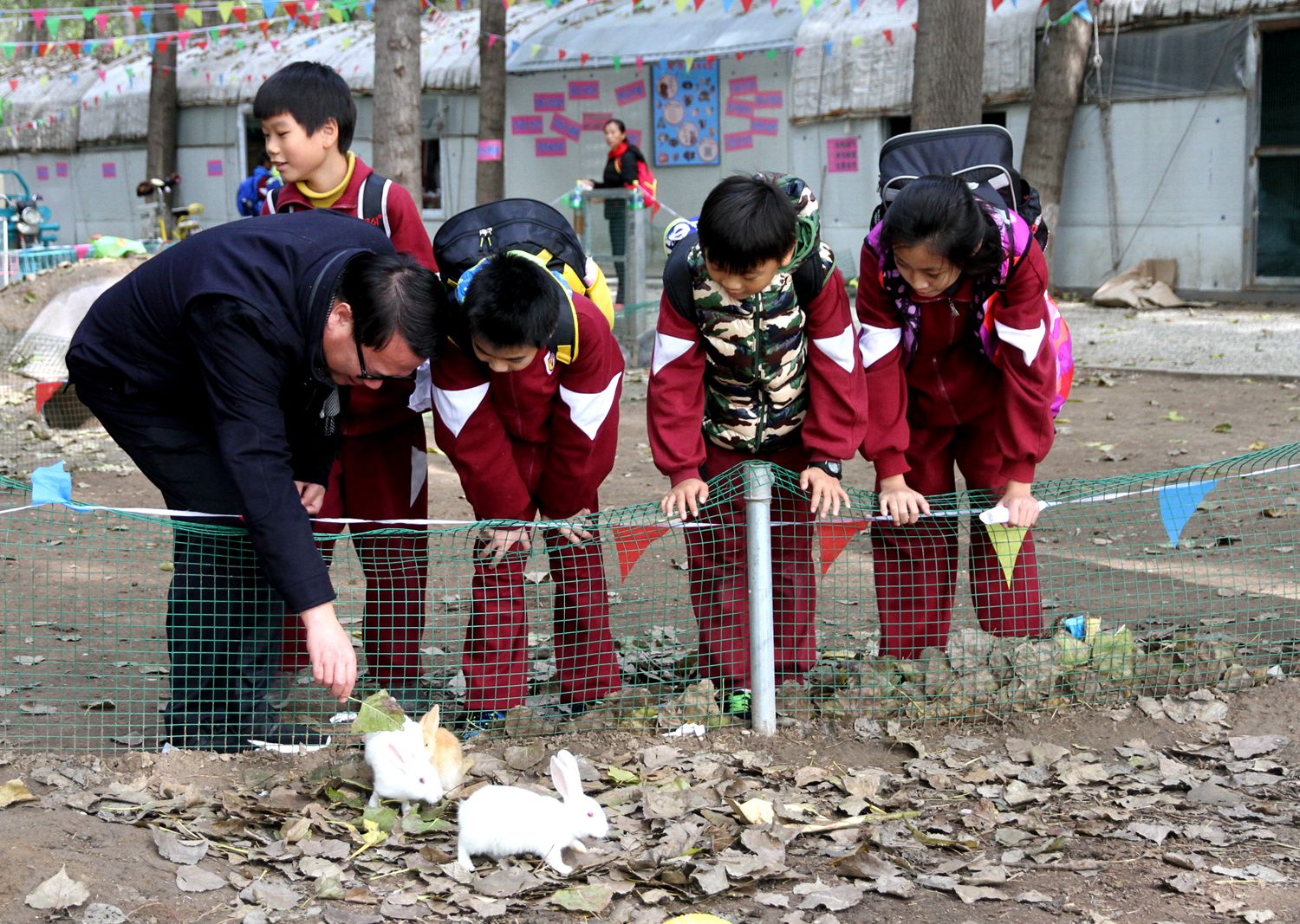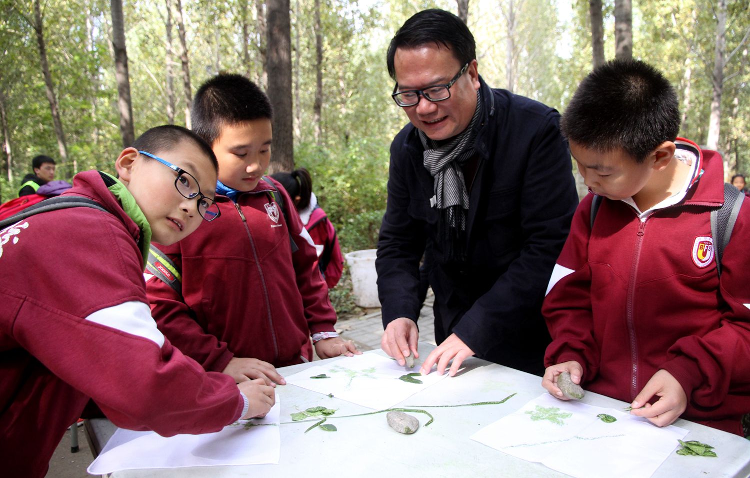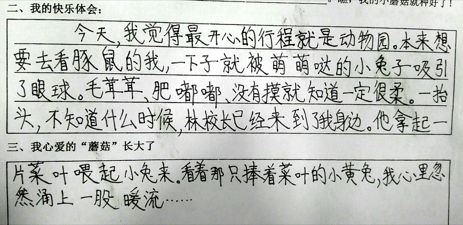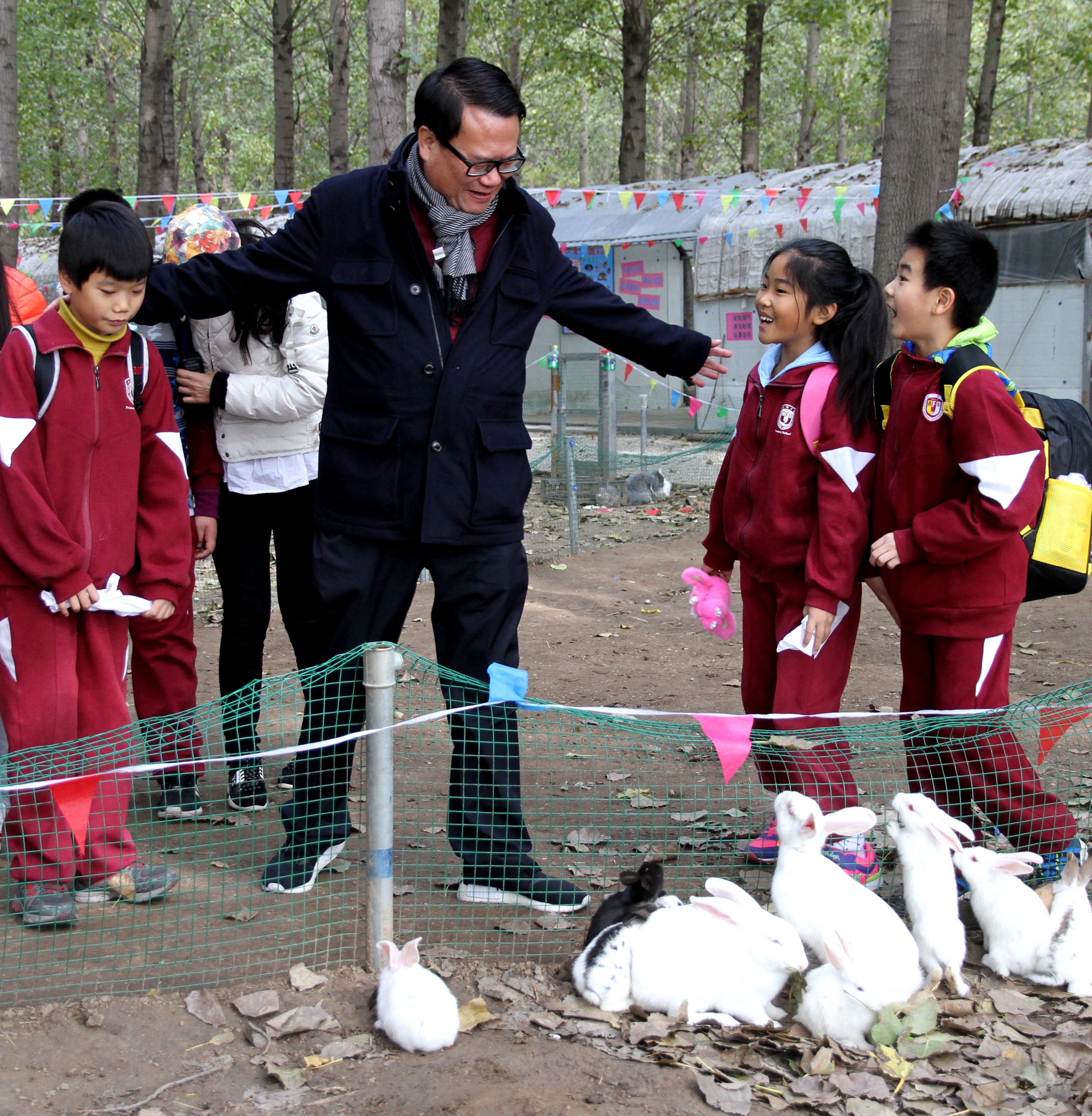 今天,我们来到田妈妈蘑法森林上社会实践活动课,林校长也来到我们中间一起活动。在森林动物园,他拿起菜叶一边逗小兔子,一边和我们交流。在敲拓染实践区,他走到我们身边,跟我们围着一张桌子,认真的用树叶拼好图形,拿起石头使劲的敲击,一边敲击一边还欣赏我们稚嫩的创作。那一刻,他不仅仅是校长,更多的是师长的引领和同伴的欢笑。