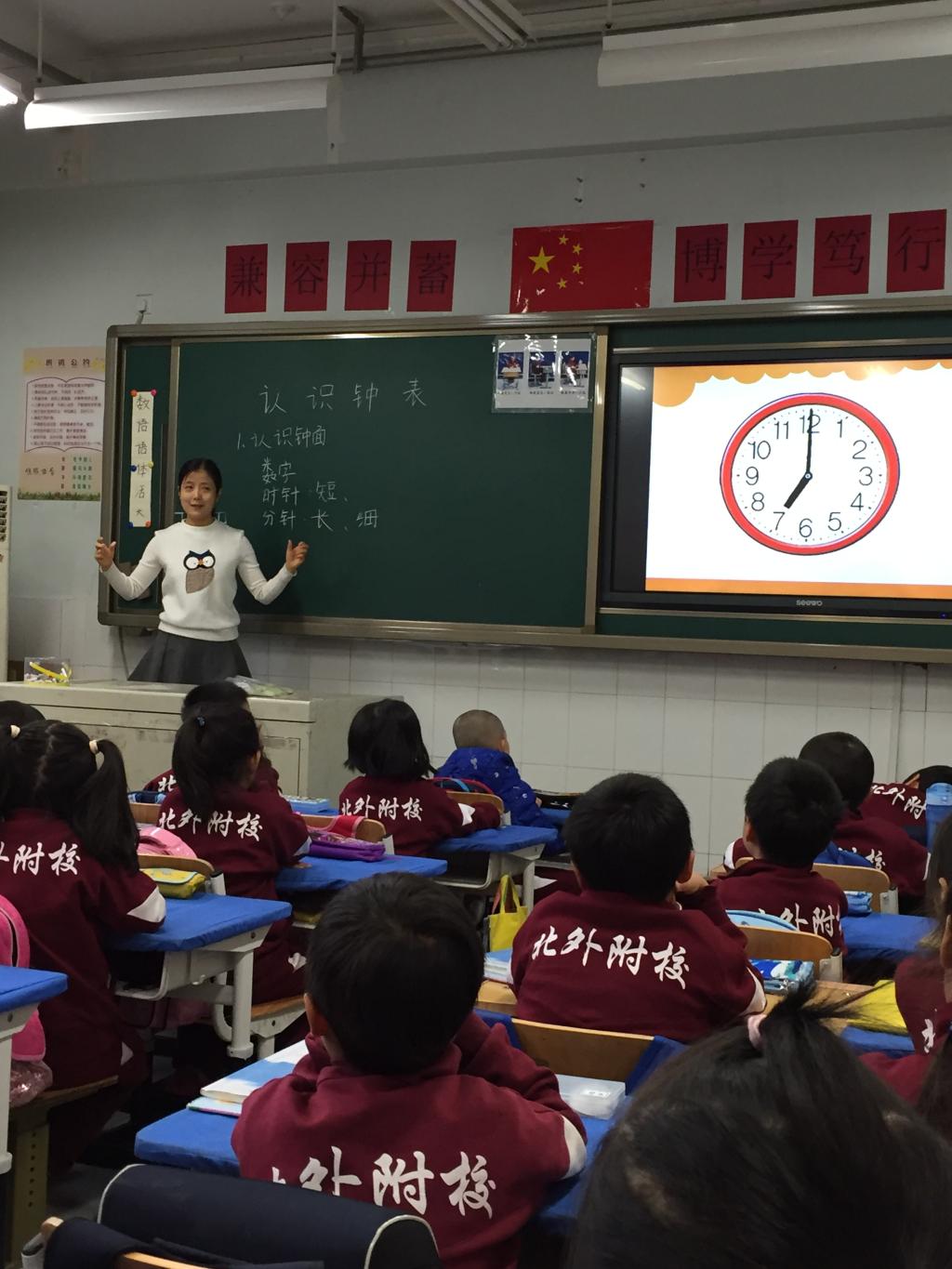 10月24日,邰青青老师在一年级5班上课的内容为《认识钟表》一课。课堂整体分为三个环节,首先认识钟面,其次是整时的认识,最后是半时的认识。在第一个环节认识时针和分针的过程中,学生观察并总结时针和分针的特点,并且和孩子一起制作了一个钟表,在制作的过程中,孩子们都积极参与。在第二和第三个环节“认识整时和半时”的过程中,以学生动手拨钟表的形式进行。通过动手实践,真正引起了学生参与的积极性,加深了孩子对整时与半时的理解,并对钟表的认识有了更高更深的层次。