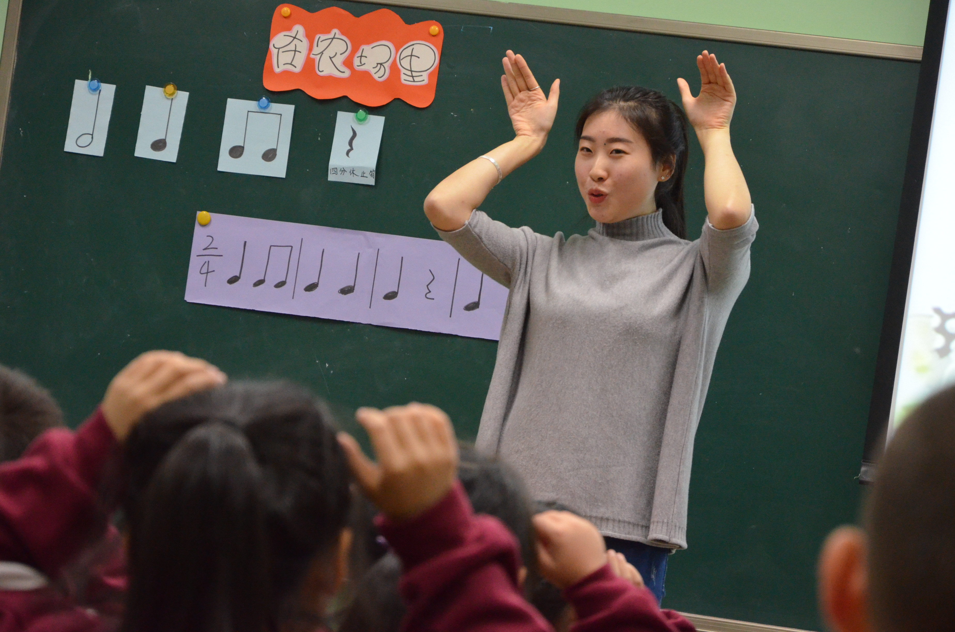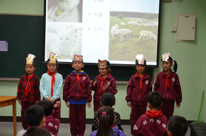 袁晓薇老师讲授的是二年级音乐活动课《在农场里》,其本节音乐活动课的艺术目标是在学习歌曲的基础上,结合歌曲内容,充分发挥想像力,编创各种各样的歌词,并结合歌词进行即兴动作表演。袁老师在本课教学时,利用农场是充满生机和活力的地方,各种动物在这里悠然自得地生活。将歌唱、体态律动、创编歌词等学生喜爱的活动融入《在农场里》。这首歌旨在通过学生对农场里各种声音的模仿、想像与创造使歌唱学生的听觉、观察力、模仿力、创造力等诸多能力得到锻炼和提高。