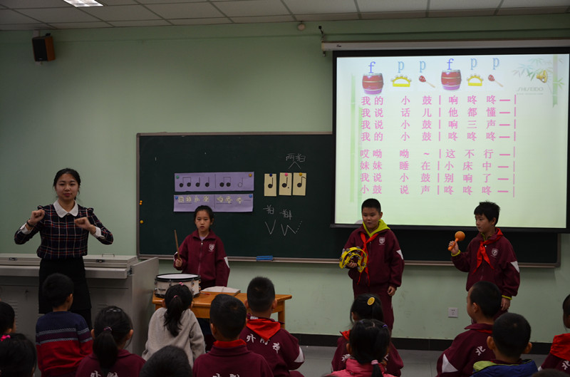 左爱一老师教授的是二年级歌曲《小鼓响咚咚》,她不仅教学生会唱歌曲,还充分启发学生想象,小鼓响咚咚热烈欢快,声音要唱得响亮一些,小宝宝睡觉时声音要唱的轻一些,同时还注重自身的体态语,通过动作神态和表情,以无声的语言向学生表露和传递内心的情感。用表演唱的形式让孩子对歌曲产生了兴趣。他们以极大的热情和高度的注意力去听、去看,去感受歌曲中愉快高兴的情绪。总之,这节音乐课充分发挥音乐教育的特有功能,促进学生身心的全面和谐发展。