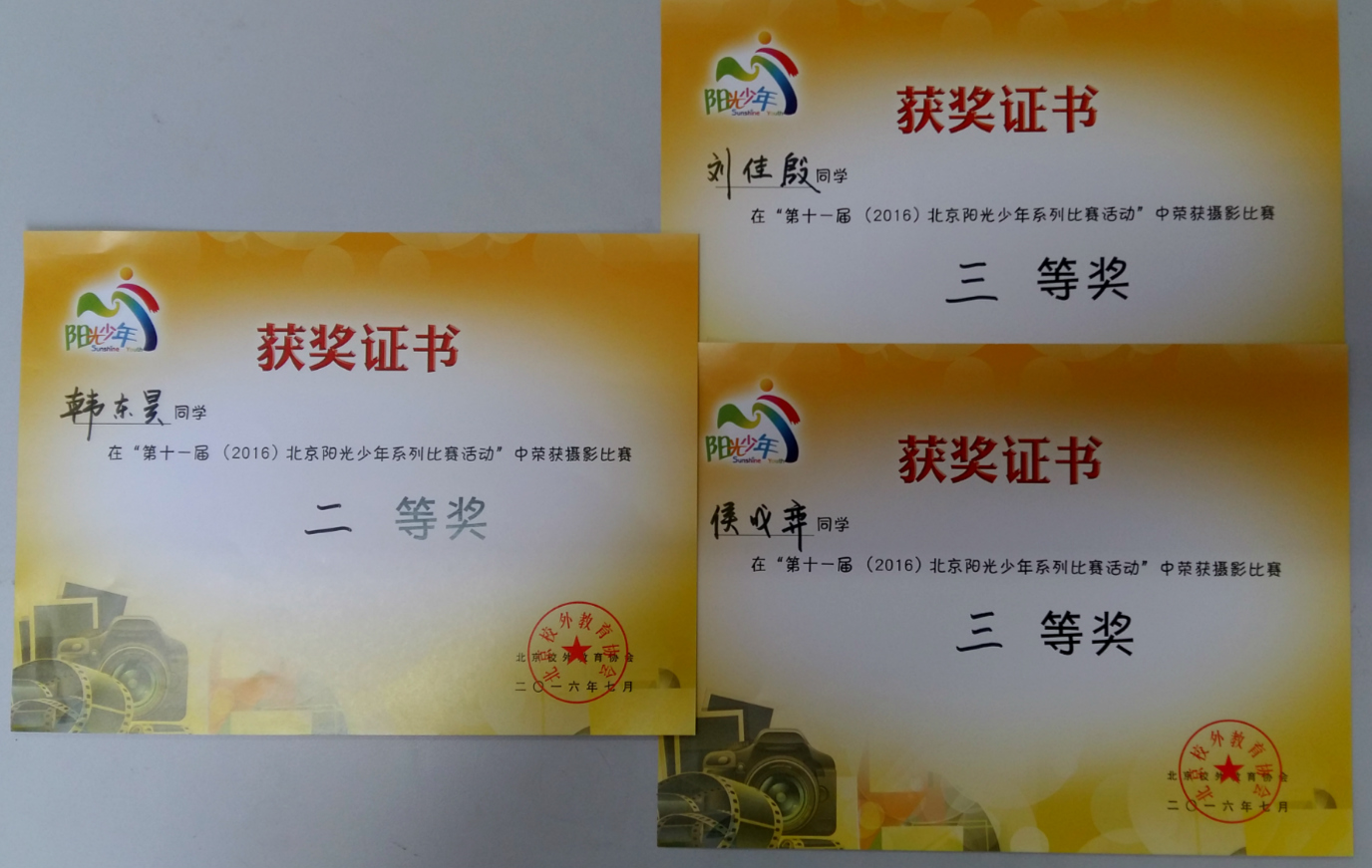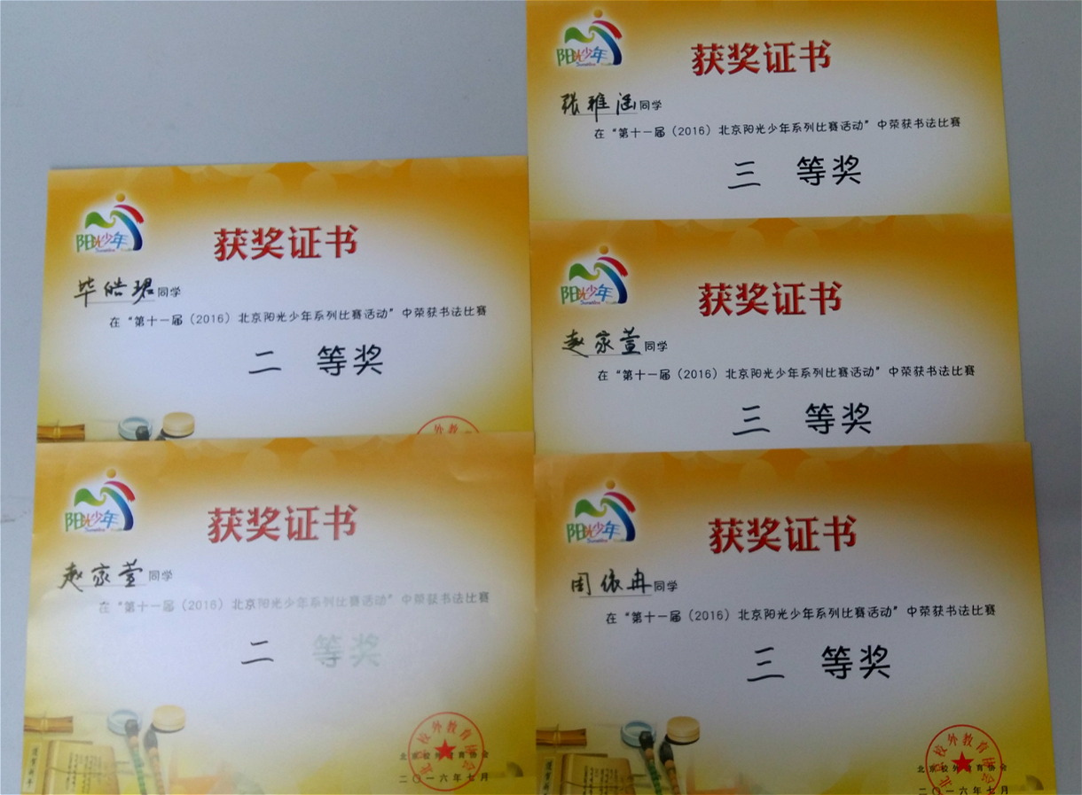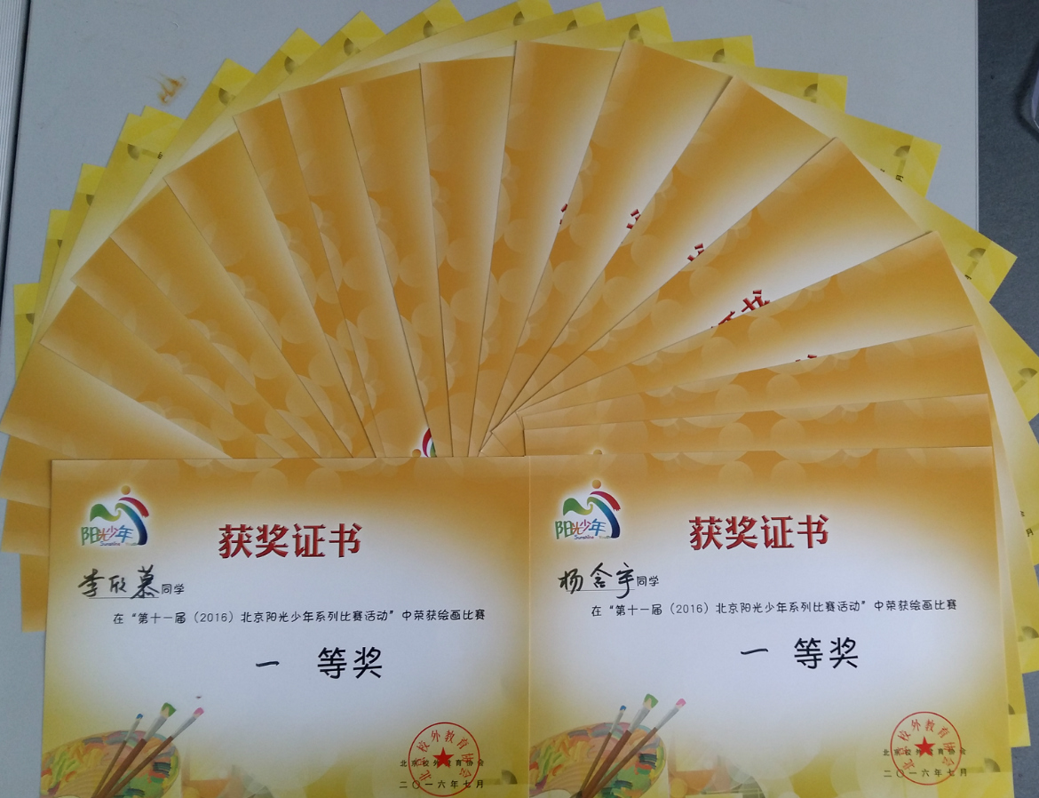 2016年7月,我校美术组教师带领学生参加了由北京市校外教育协会举办的“第十一届(2016)北京阳光少年系列比赛活动”。该比赛旨在引导学生积极参加阳光少年活动,提高综合素养和创新实践能力,同时培养学生对美术学科的兴趣与自信。同学们通过绘画、摄影、书法等方式展示出了丰富的课外、校外文化生活,其中30名同学喜获佳绩: