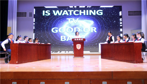 辩论赛分为初赛和决赛两个阶段,各班经过激烈的较量,选出代表参加决赛。本次大赛评委由来自多伦多大学的外籍教师、英语教研组长和各年级英语备课组组长以及优秀学生代表担任。正反双方各四位辩手参加辩论,辩论赛分为开篇陈词、自由辩论和总结陈词三个部分。本次决赛在热情帅气的开场舞“TV Time”中拉开帷幕。辩论紧紧结合年级本月学习主题“What’s on TV?”。第一轮,选手们就初赛辩题“Watching TV is good or bad?”展开角逐。小辩手们都准备充分,正、反双方凭借自己搜集到的资料,结合自身生活体验,分别从不同的角度阐述了己方的观点,各位辩手唇枪舌剑,妙语连珠。中场由王子侨同学给大家带来一段爱迪生模仿秀。第二轮,由主题衍生,选手们就“Paper books and e-books, which is better?”为辩题展开了激烈的辩论。双方辩手针锋相对,据理力争,形成了群雄舌战的场面,现场气氛十分热烈。精彩的辩论赢得了在场师生的阵阵喝彩。此次辩论赛在欢乐的歌舞剧“The Circus”中落幕。