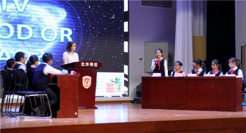 我校历来注重学生的全面发展,从“未来的视角”培养今天的孩子。本次辩论会秉承林校长提出的:教学就是为了“让——学习”发生这一理念,外语教学不仅要使学生掌握语言的语法、词汇、一般智力技能或在交际中所行使的人际功能,更要关注学生实现交际情景中的交际需要。此次辩论赛坚持以人为本,关注孩子的感受和体验,将课内学习和课外活动相结合,培养了学生的创新精神和思辨能力。