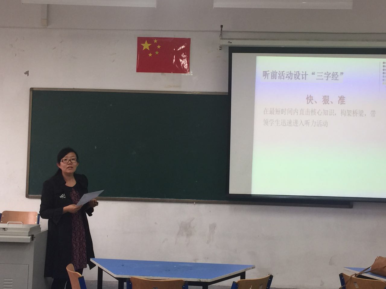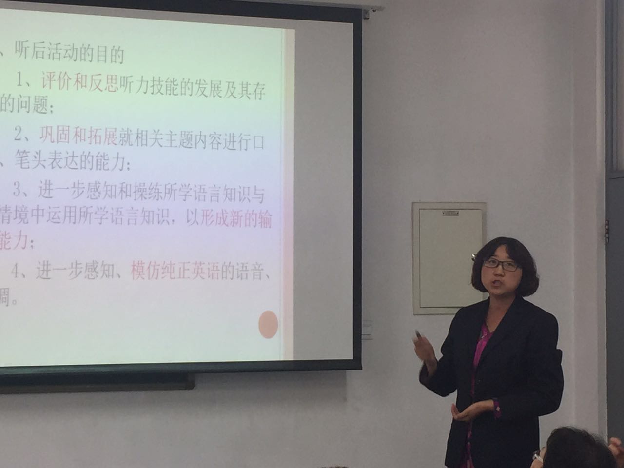 首先,教研组长刘娟老师介绍了本学期初中英语三个成功申报了海淀区课题的课题组的研究进展情况以及开学以来“一师一优课”的录制情况,接下来由谷丽华、李广智、吴芳、李玉英和张霞老师代表初二备课组暨“初中英语课堂听说策略研究”课题组进行了关于听说课教学策略的研究成果的汇报展示。