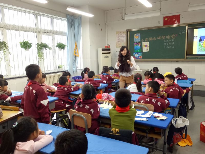 新任教师虞静老师讲授的是二年级美术课《小花猫在哪里睡觉?》。在之前一课《小花猫在睡觉》中,学生已了解小猫的结构,掌握小猫的动态以及四肢的摆放,并为自己的小花猫添加头饰、衣服等装饰。在这节课中,学生首先通过照片了解小猫可以在哪些地方睡觉,然后通过小短片以及作品赏析了解小猫睡着后发生的小故事。通过老师的示范,学生体会到了小猫在“海、陆、空”不同的地方睡觉时的不同状态,最后通过小组讨论、学生发言、展示优秀的作品,让学生提高审美情趣的同时,了解到不同工具表现出的不同的效果。整节课以一个个的小故事串联,激发了学生的兴趣和积极性,启发了学生的思维,拓展了学生的想象力,让学生由小花猫睡觉展开了丰富的联想。