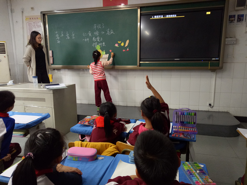 新任教师赵晋一在二年级课堂讲授了《丰收了》这节美术课,赵老师把该课主要分为两部分:一部分是丰收色彩的表现,另一部分是丰收场景的勾勒。通过观察、感受、体验、师生互动等方式学习本节课的重点与难点----如何运用恰当的前后遮挡关系以及画面中疏密关系。培养学生热爱生活的情感,以及学生的创新意识。