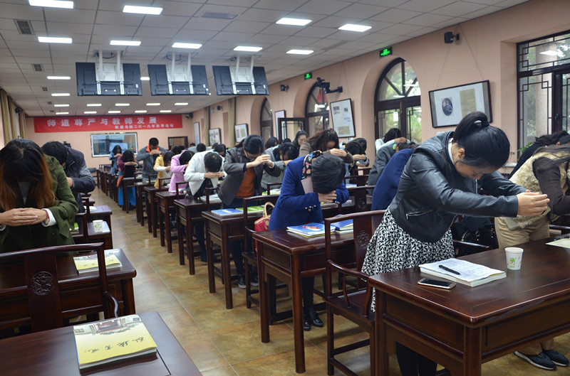到达书院第一件事就是在书院高峰老师的指引下祭拜道贯古今、德配天地的“教育始祖”孔子。全体老师恭敬的向万世师表——孔子像四行拱手礼,以表内心的敬畏之情。在进行了庄严的行礼仪式后,全体教师回到笠僧堂聆听了原东方道德研究所所长王新宏教授的讲座——“儒学 • 师德 • 教育”。王教授引领老师们一起回顾了“儒家”学说的发展历程,并对儒家学说中道德教育与师德教育进行了详细的解读,让老师们对儒家经典中所传递的“安贫乐道”、“有教无类”等师德内容有了更深层次的认知与理解。在这古色古香的书院建筑群内,教师们感悟着儒家学说的博大精深,接受着儒家修身思想的洗礼和熏陶,塑造着属于自己的那份“纯粹”的教育情怀。