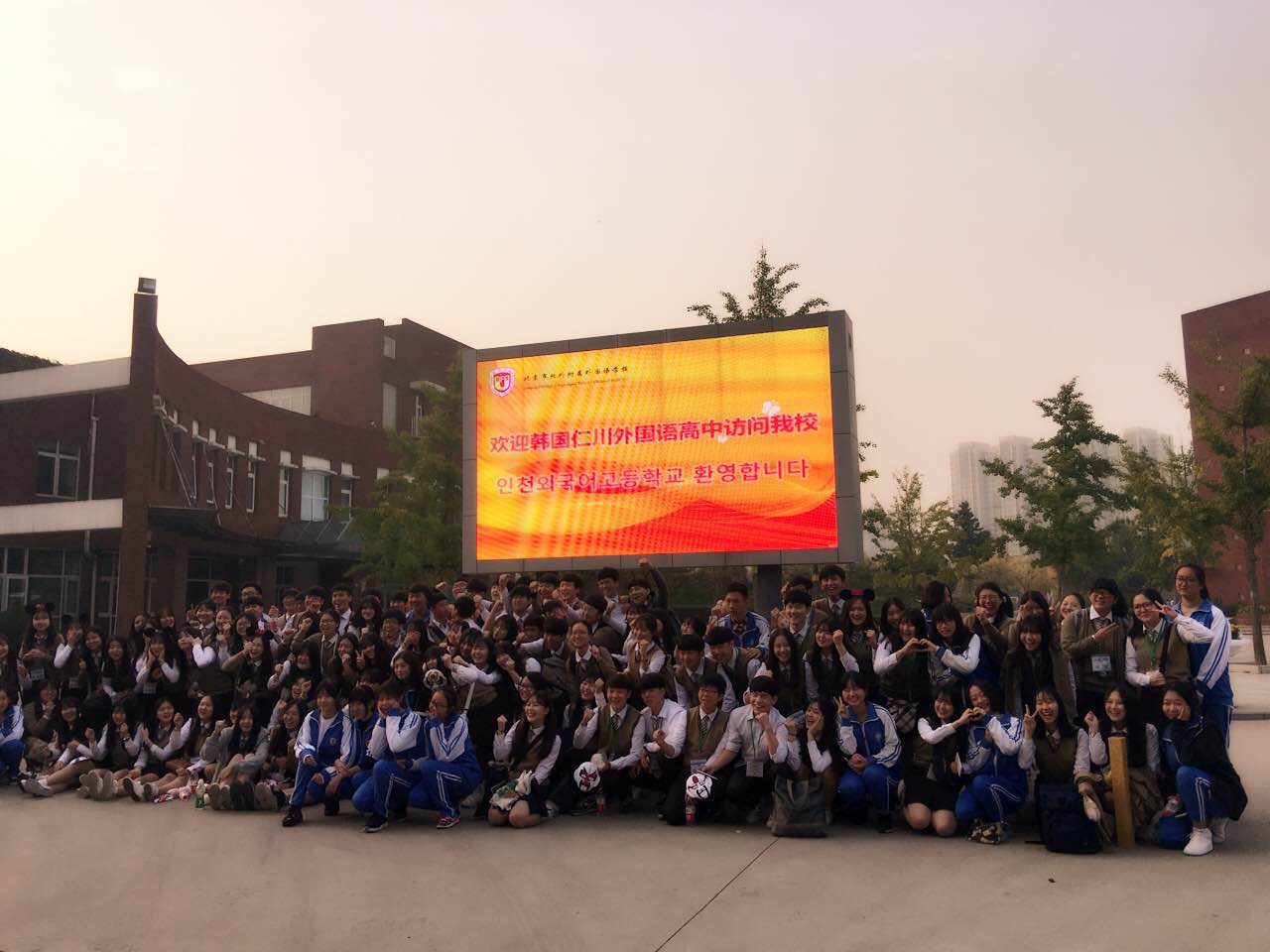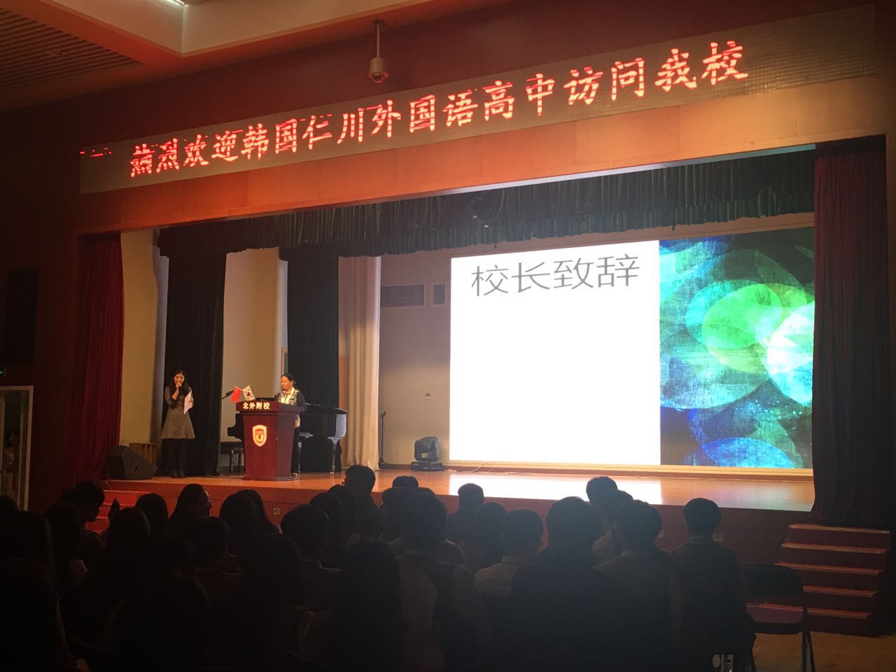 我校副校长、副书记高雁鸣、副校长张继军、高中校区副校长王静,及高一、高二年级师生代表参加了欢迎式,张继军向来宾致欢迎辞。她在致辞中介绍了我校的办学特色,回顾了两校多年来的姊妹校友谊之旅,祝愿来访的同学们在我校精心设计的多种活动中度过愉快的一天,通过体验中国文化,加深双方友谊,开阔国际视野,提高作为杰出亚洲青年和优秀世界公民的综合素质。仁川外国语高中的权校长致感谢辞,感谢我校的热情招待,预祝我校和仁川外国语高中的友谊长存。