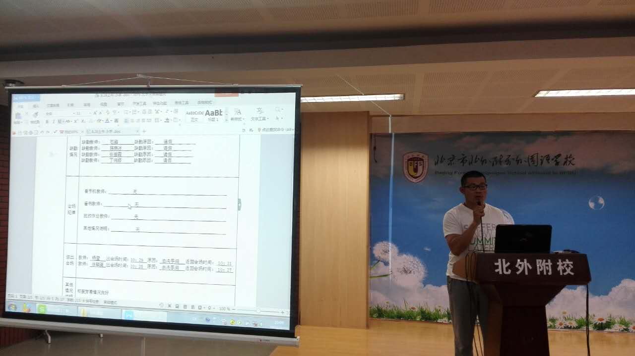 大会伊始,德育副主任杨建老师通报开会至今德育工作。杨主任给全体教师展示了开学以来一个月时间里小学校区师生教学和生活的精彩片段,包括学生上下学接送情况、国防教育活动、安全卫生检查以及小学校区开展的文明礼仪活动。通过这些图片和事项的讲解,我们对过去的工作进行了总结,吸取了以往的经验和教训,并为我们以后的教学工作进行了很好的指导,如班主任日常工作的布置、班级卫生工作、消防安全检查等,杨主任的汇报为广大教师以后的教育教学工作指明了方向,使得我们对以后的工作有了更加清楚的认识和更加明确的目标。