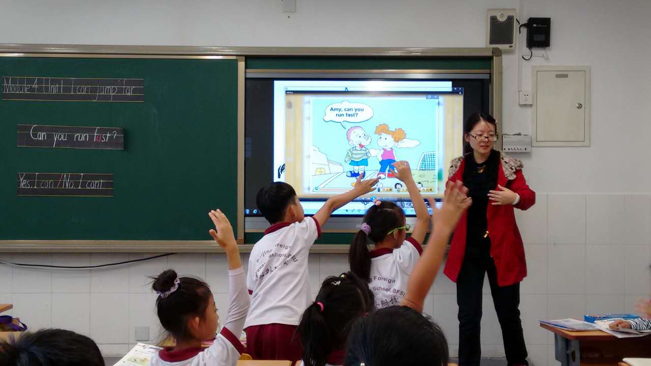 为了进一步加强我校教研工作,充分发挥骨干教师的引领作用,北外附校小学校区在近期组织开展了骨干教师公开课。9月28日周三上午,海淀区小学英语学科带头人季晓霜老师在北外附校三年级英语专业教室上了一节生动活泼、兴致盎然的校内骨干教师引领课。季老师教授的内容是外研社新标准三年级上册Module 4 Unit 1 I can jump far。