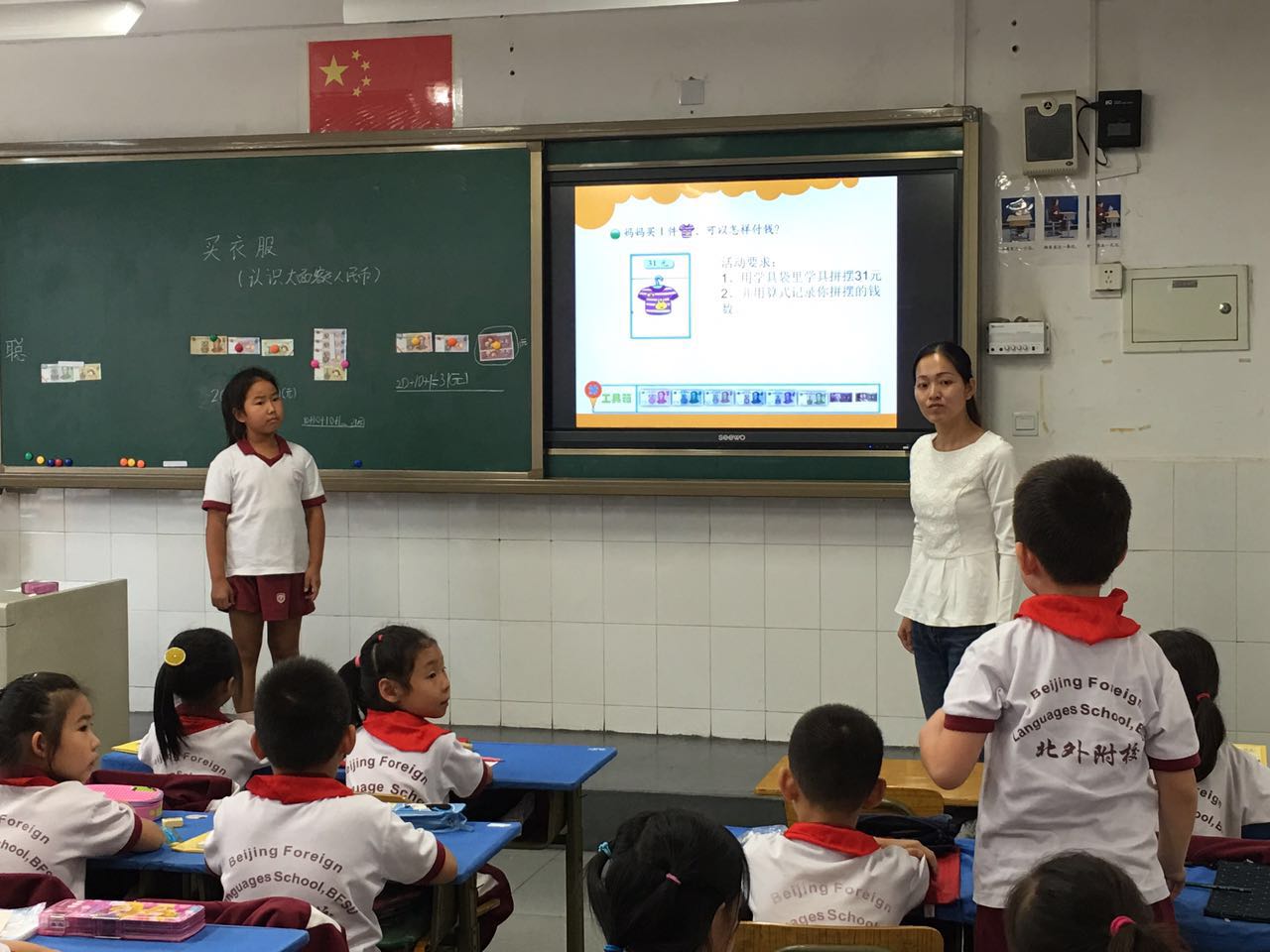 于老师创设了中秋节带宝宝去买衣服的情境,服装店里的衣服都很漂亮,最终确定买一件31元的T恤。在此期间对学生进行德育渗透,培养孩子们节约、不铺张浪费的优良品质。再让学生用已经学过的小额人民币付钱,让学生感受大额人民币产生的必要性。导入课题《认识大面额人民币》。