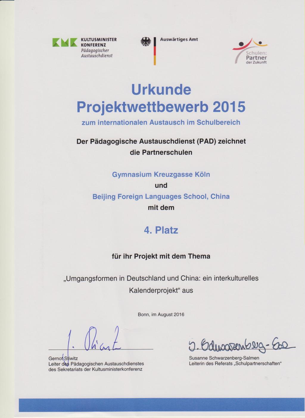 在刚刚结束的德国文化教育部国外学校交流项目会议上,我校2015年与科隆姊妹校共同制作的交流项目从参选的120多所学校的作品当中脱颖而出,获得全德第四名。