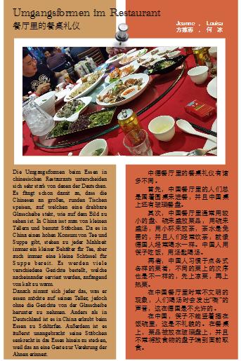 我校与德国科隆Greuzgasse中学自2008年建立姊妹校关系,互派师生交流学习,相互借鉴发展,每年双方都会确立一个主题进行项目制作,2015年的主题为“Umgangsformen in Deustchland und China”(“中国和德国的礼仪”)。在制作项目期间中德学生共同讨论并配以图片和文字加以说明,内容着重突出中德之间的异同比较,最后以日历的形式展出。