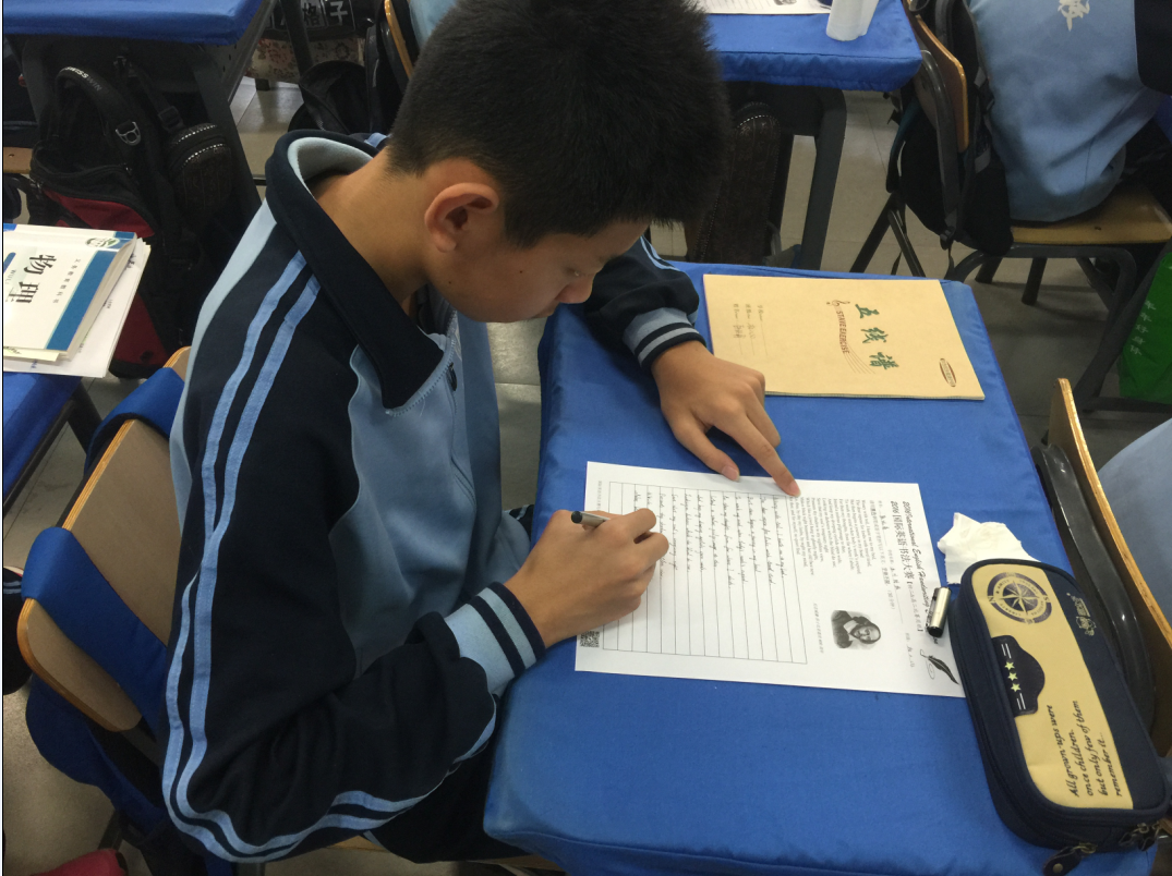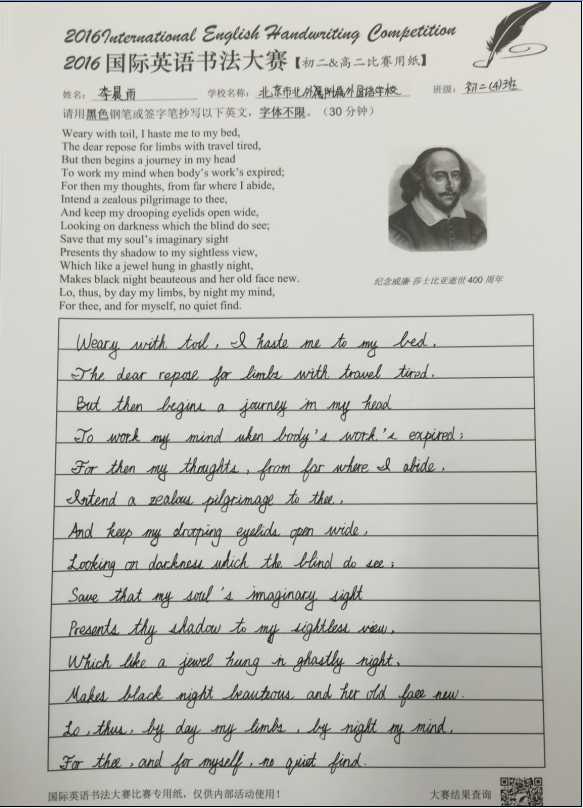 2016年恰逢世界文学巨匠、戏剧家、诗人,莎士比亚逝世400周年。9月21日,初二年级以“致敬文学经典、体会诗歌魅力、传播书法文化”为主题,举行了国际英文书写大赛,向经典致敬!初二年级共200余名学生参加了比赛,书写内容为莎士比亚的十四行诗。
