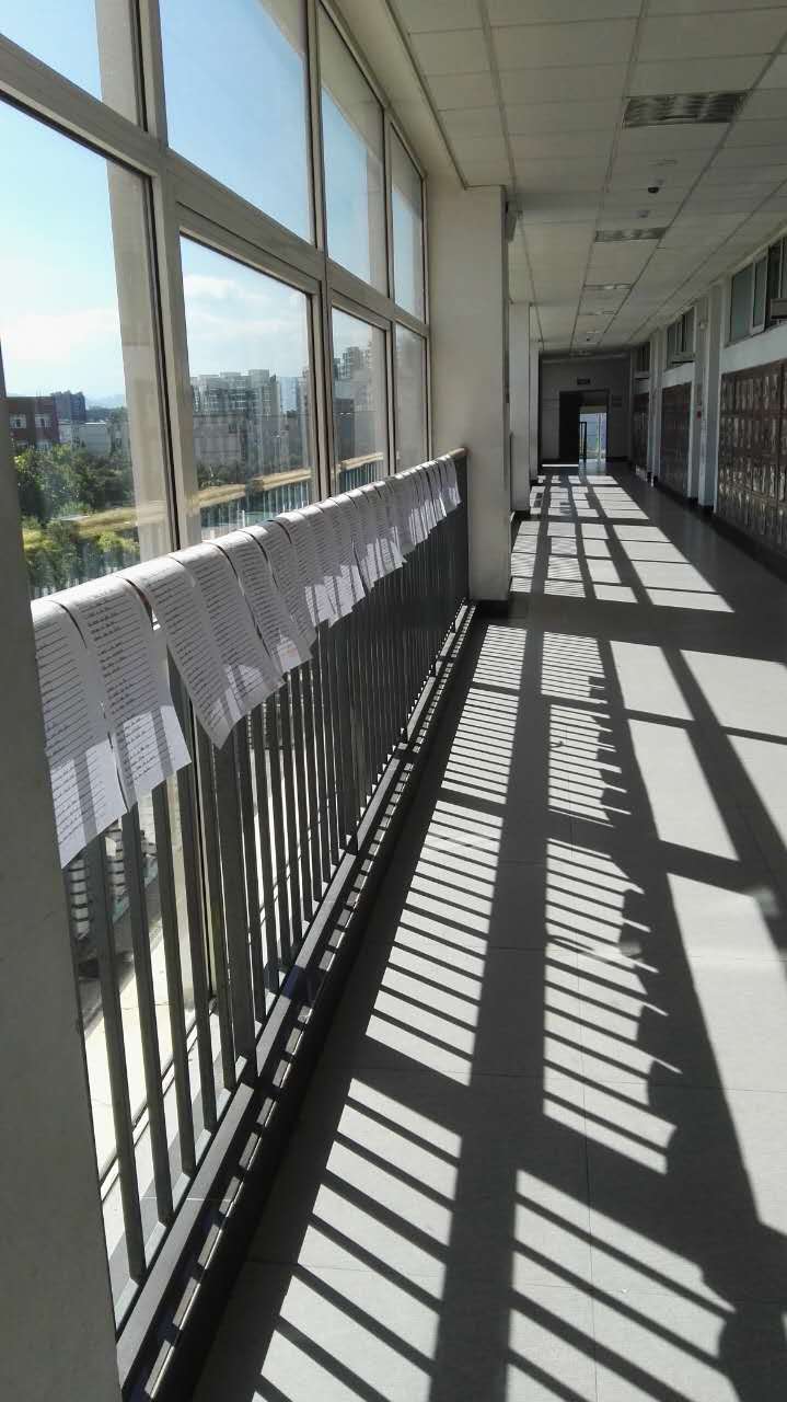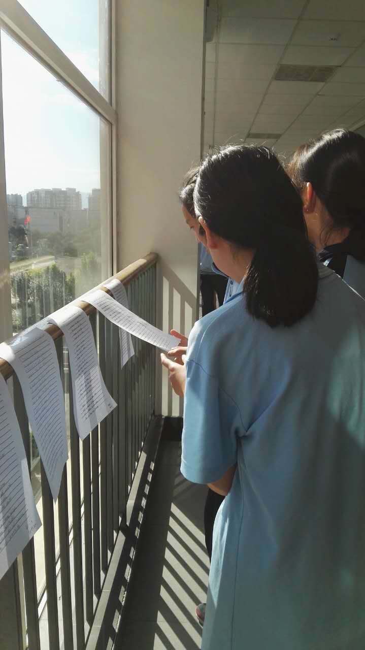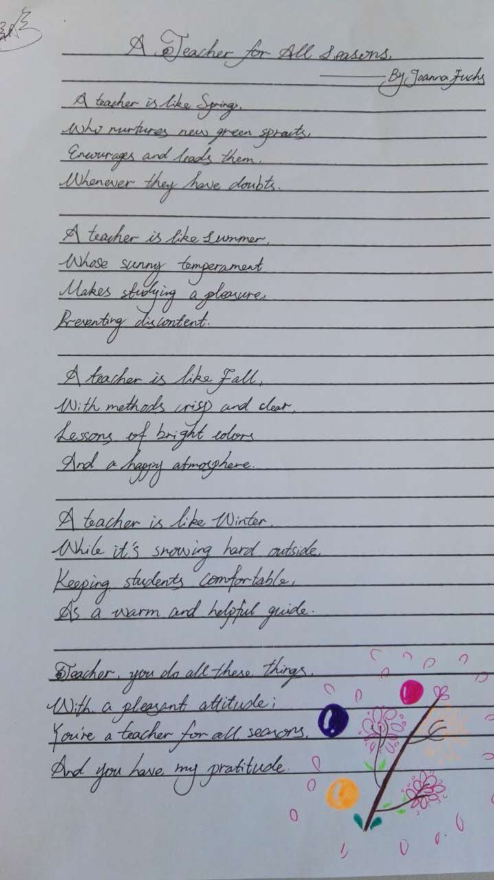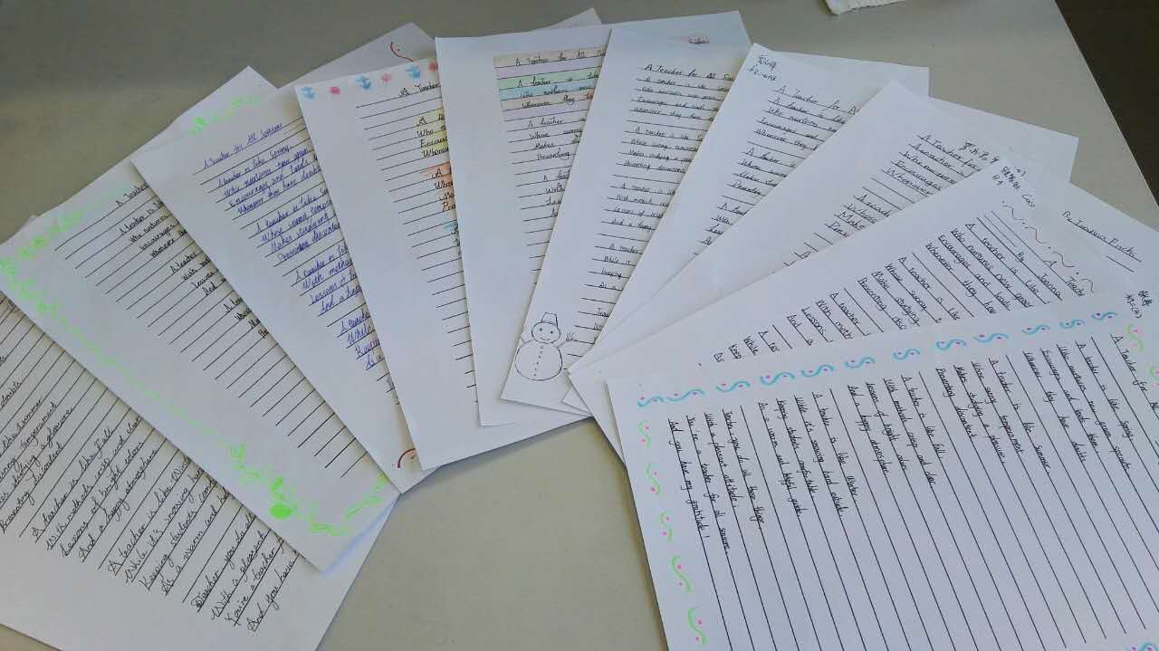 当各班优秀作品在教室对面的栏杆上展出时,同学们都驻足观看,点评比较,纷纷表示以后要多练字,为老师争光。上课了,教室里书声郎朗,教室外书页飘飘,墨香隐隐,里外唱和,好一副孜孜不倦的学习景象。正如诗中所讲:“Teacher, you do all these things/ With a pleasant attitude/You’re a teacher for all seasons/And you have my gratitude! ”老师们看到学生能写出如此整齐漂亮的字时也不由得连连赞叹,同时为他们的进步感到无比欣慰。