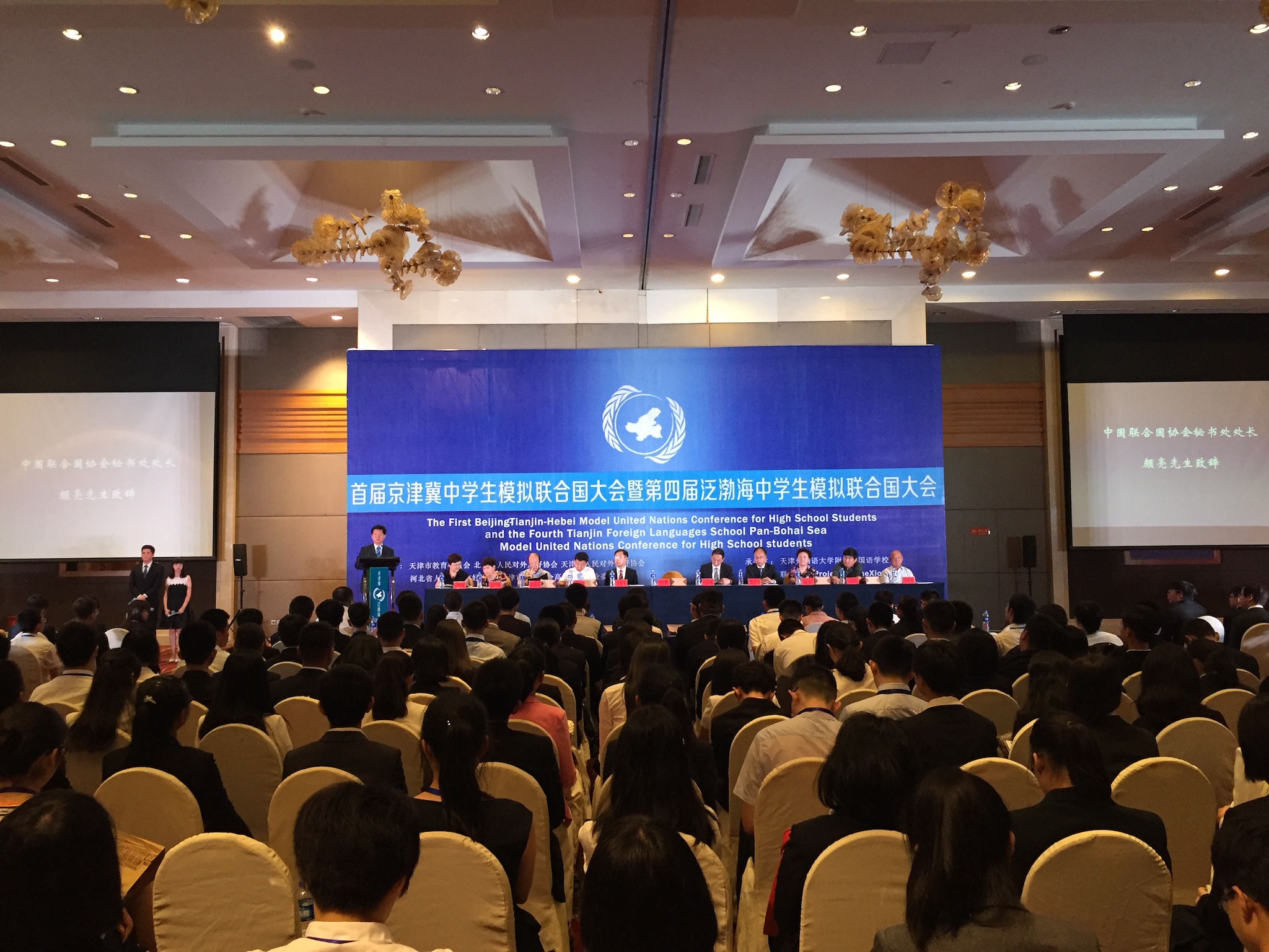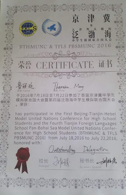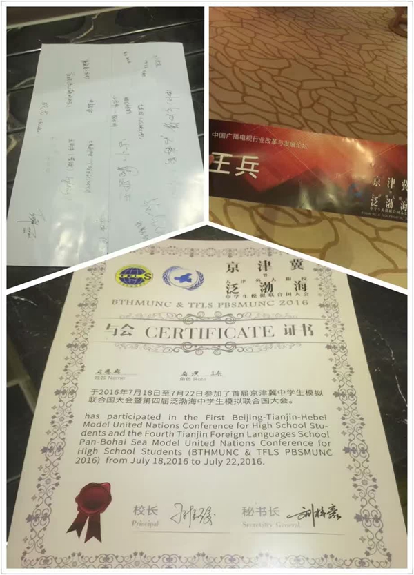 2016年7月18日至22日,首届京津冀中学生模拟联合国大会暨第四届泛渤海中学生模拟联合国大会于天津召开。本次大会由天津市教育委员会、北京市人民对外友好协会、天津市人民对外友好协会、河北省人民对外友好协会及天津市教育学会高中教育专业委员会主办,由天津外国语大学附属外国语学校承办,吸引了来自全国20多个省市70多所高中的400余名代表。在会议中,代表们齐心协力,共同贯彻大会“反思过去,开拓未来”的主题,共同探索、创造更加美好的世界。