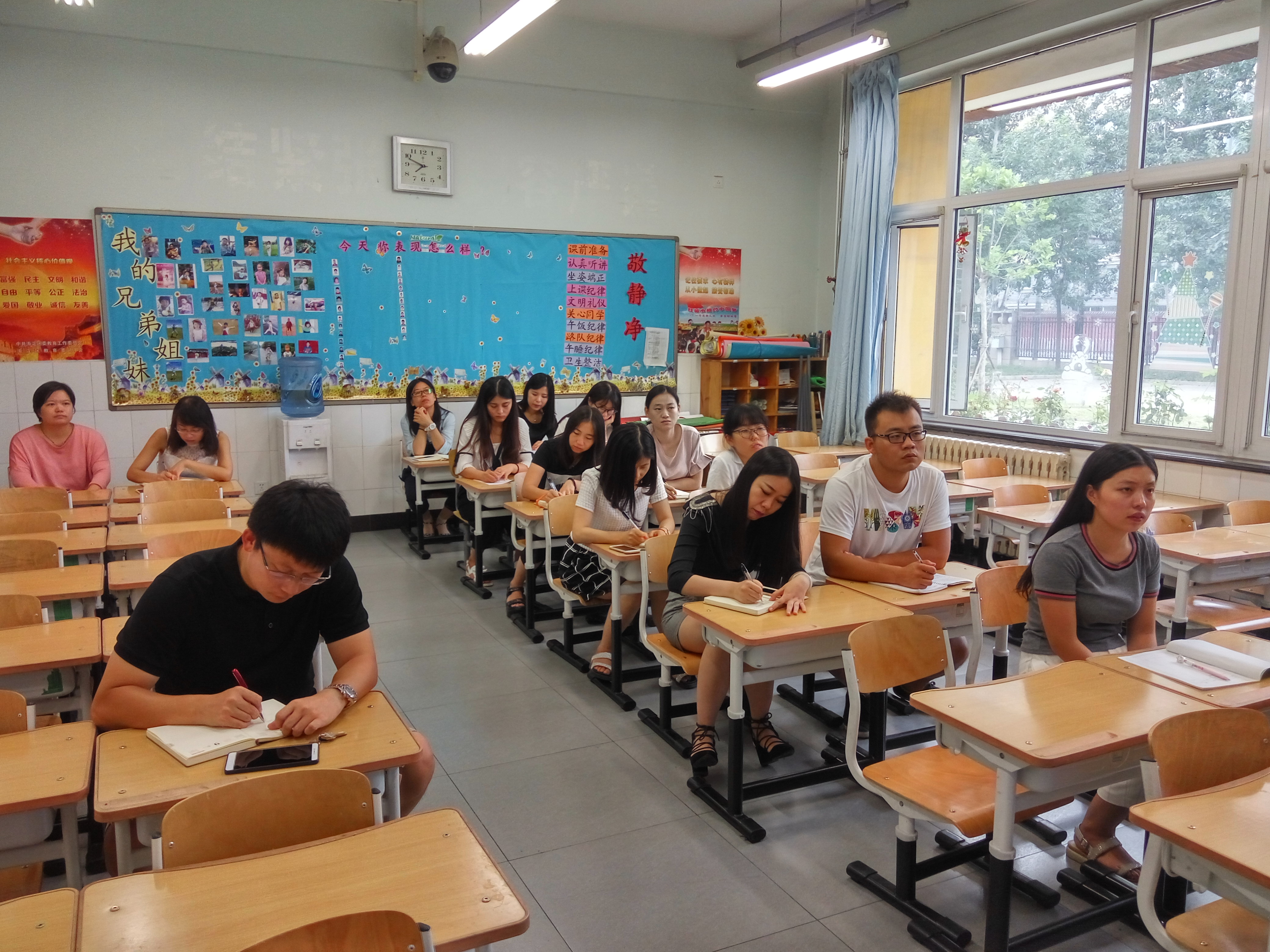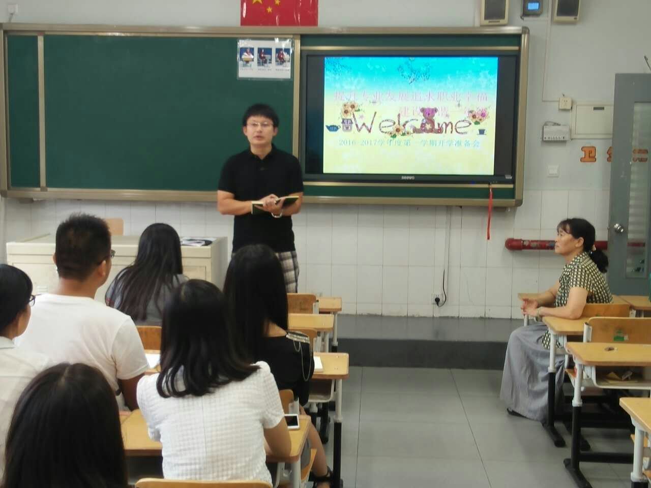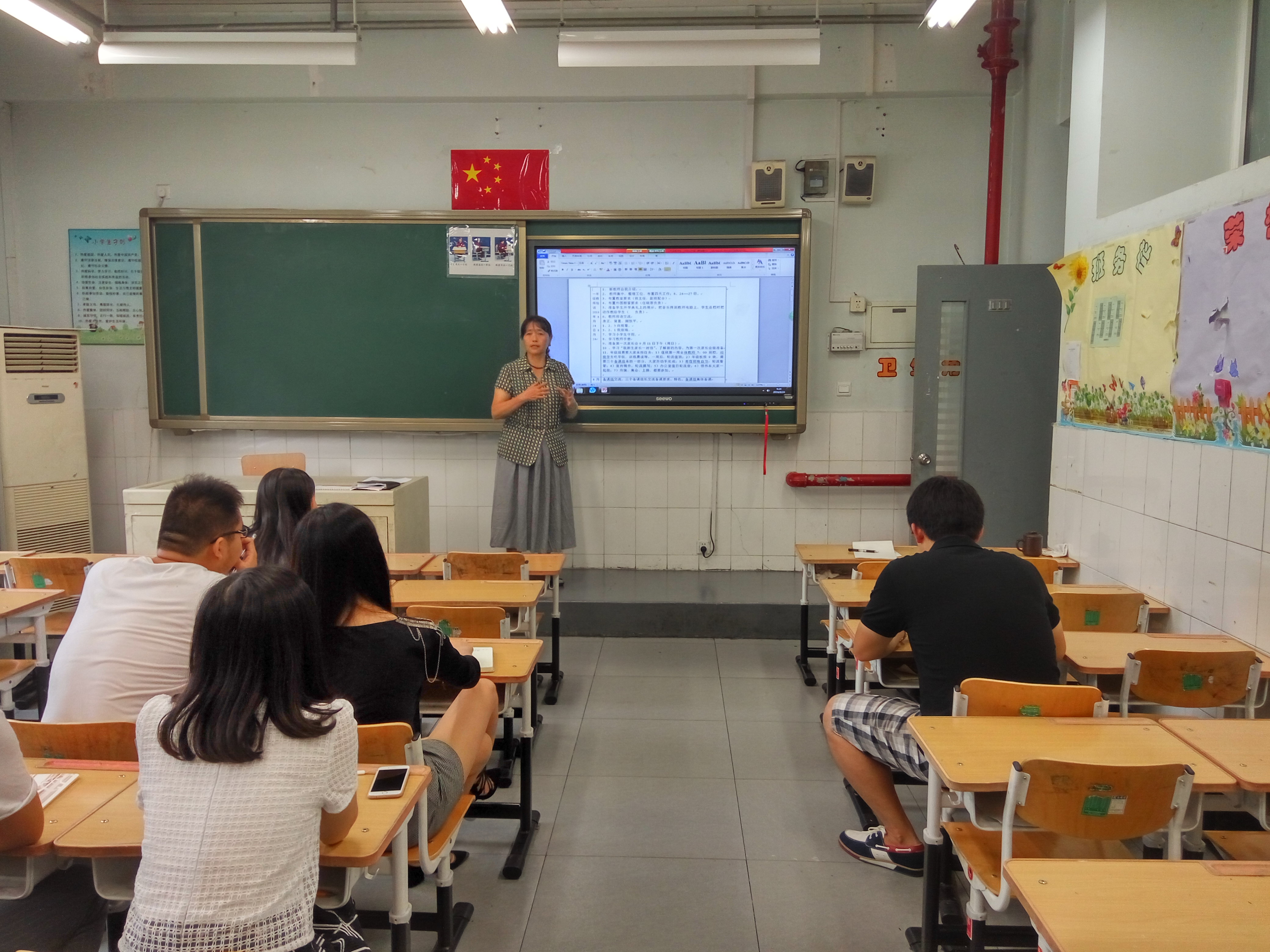 8月24日上午8:00新一年级教师精神饱满地返岗了。9:00--10:40全体教师在小教楼一(5)班集会。副校长孙亚楠参与了此次会议。
