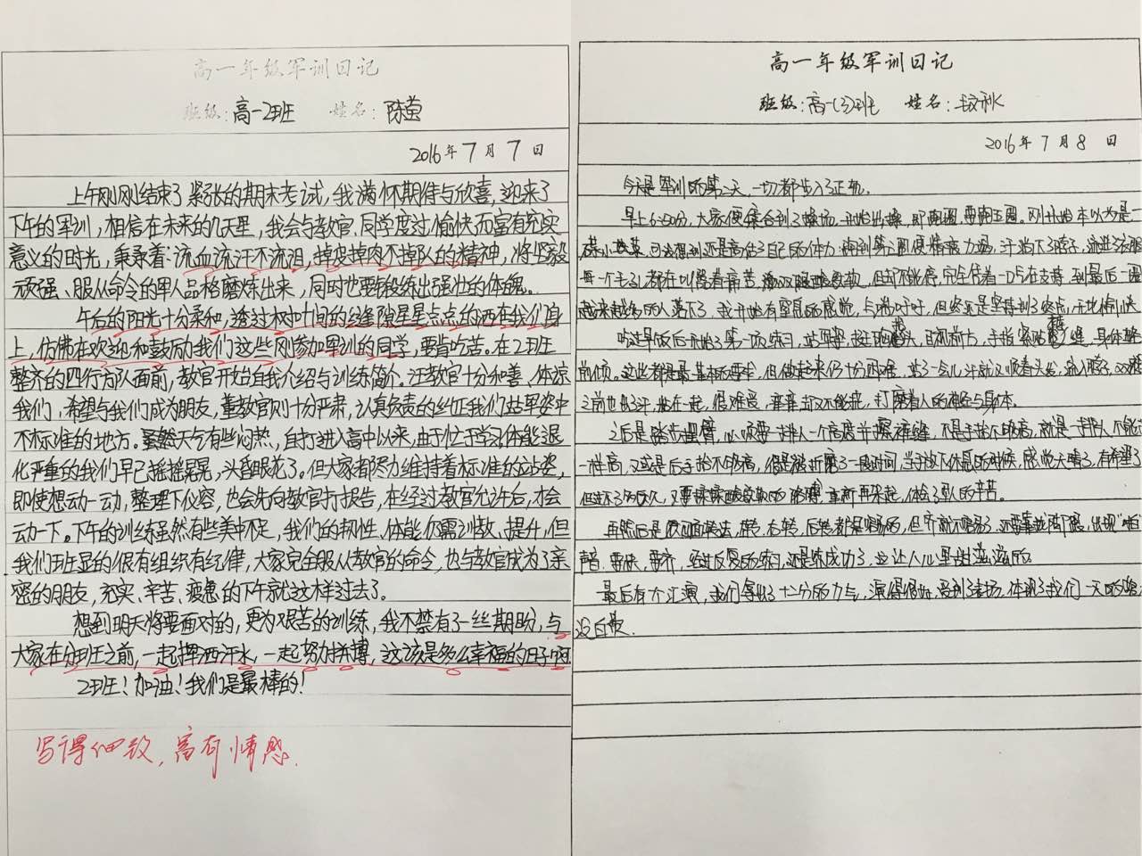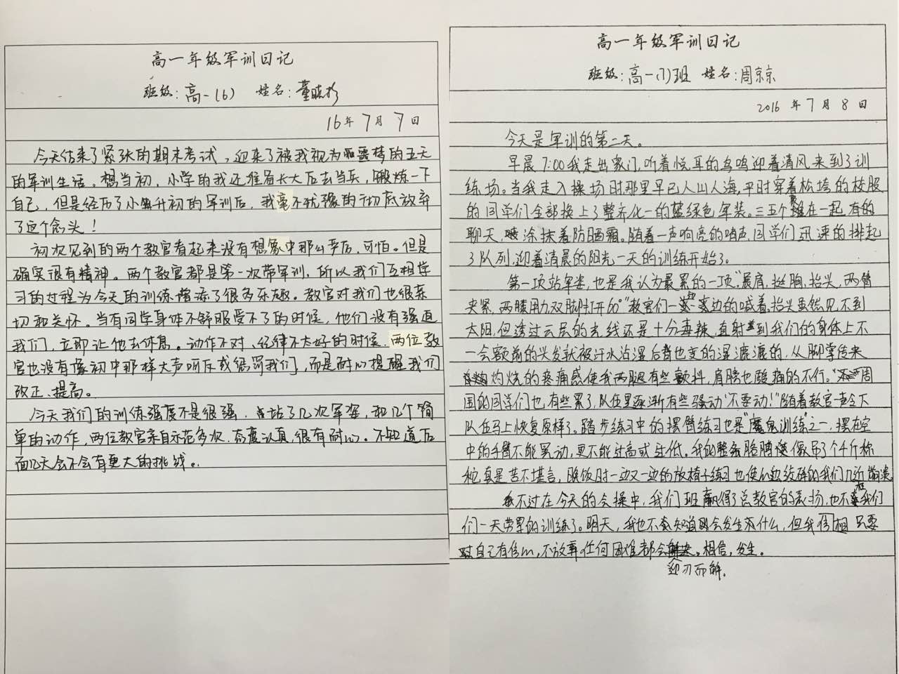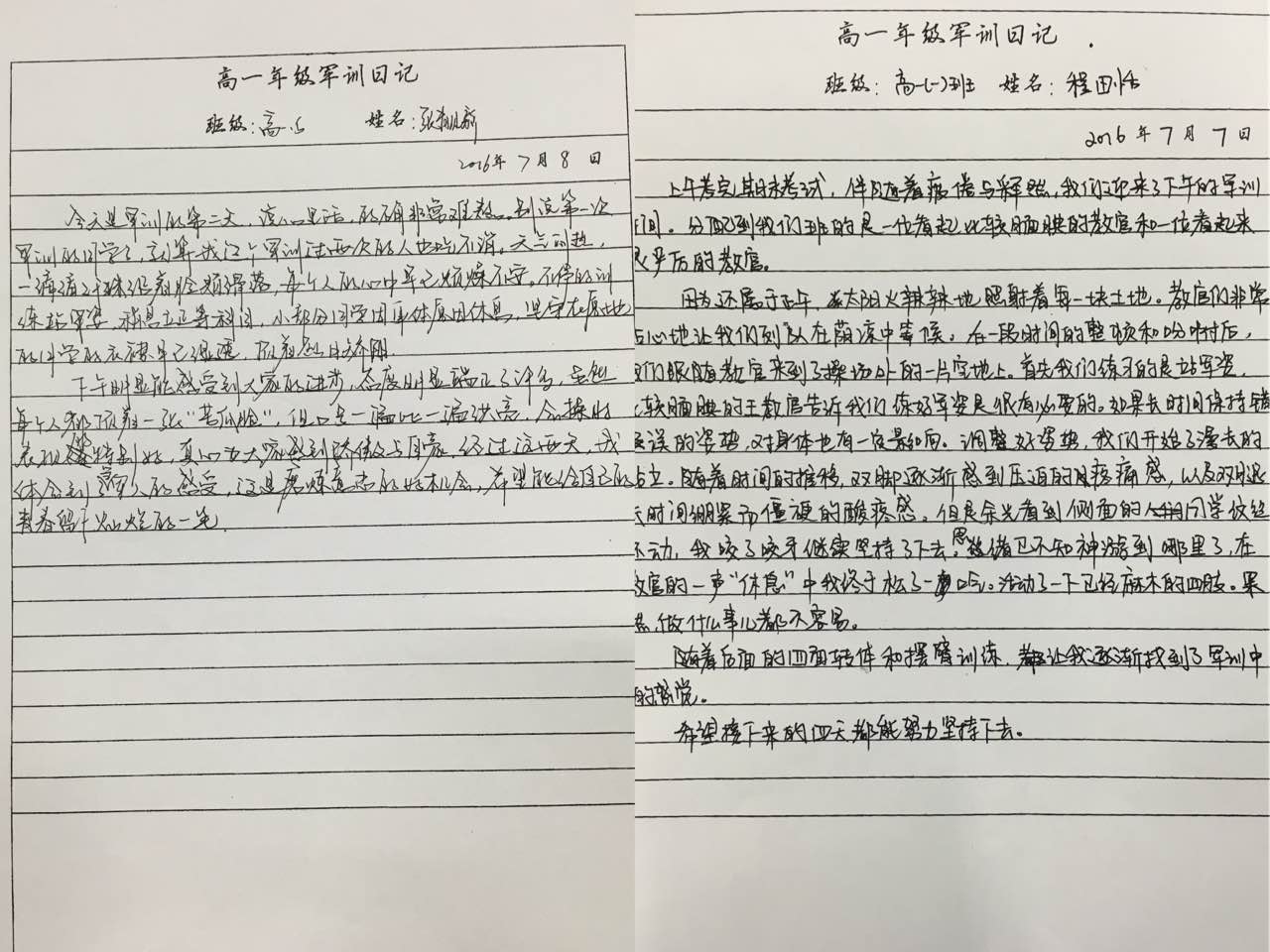 今天是军训的第三天,军训的每一天,同学们都会在晚自习时写一篇军训日记,分享自己紧张而又充实的一天的生活。从前两天的军训日记中,可以看出同学们对军训生活从有些抵触,到慢慢接受,再到现在的受益匪浅,经历了很漫长的心理和生理的考验。即使每天的训练都使大家疲惫不已,但他们每个人的日记中都仍有着对明天的期待,他们也清楚的意识到了这次军训的意义,和老师教官的苦心。他们懂得了什么叫做集体,什么叫做坚持,增强了组织性、纪律性和集体荣誉感,努力向教官的方向去看齐。今后他们会不只是在操场上严于律己,更会将军人严谨的作风融入到学习和生活中,提高学习和生活质量。我们也相信他们会在未来的生活中以更加积极向上的心态,更加饱满的热情,去迎接挑战。