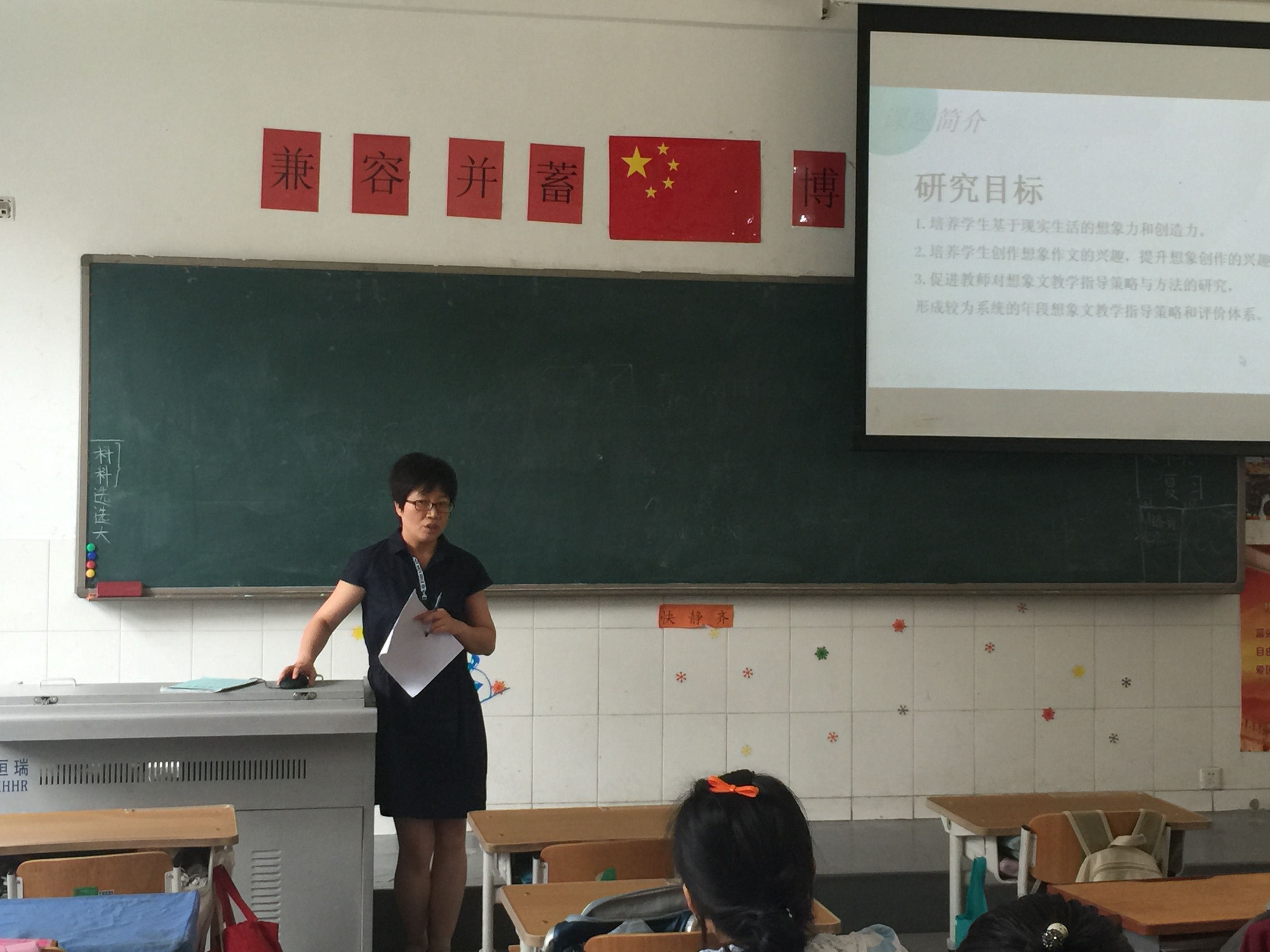 第二部分由石霞老师对想象文课题做了中期汇报,石老师介绍了课题的研究情况,理清了各学段的想象目标与重难点,并围绕“六大想象策略”进行了成果展示,最后提出了研究后期的设想。