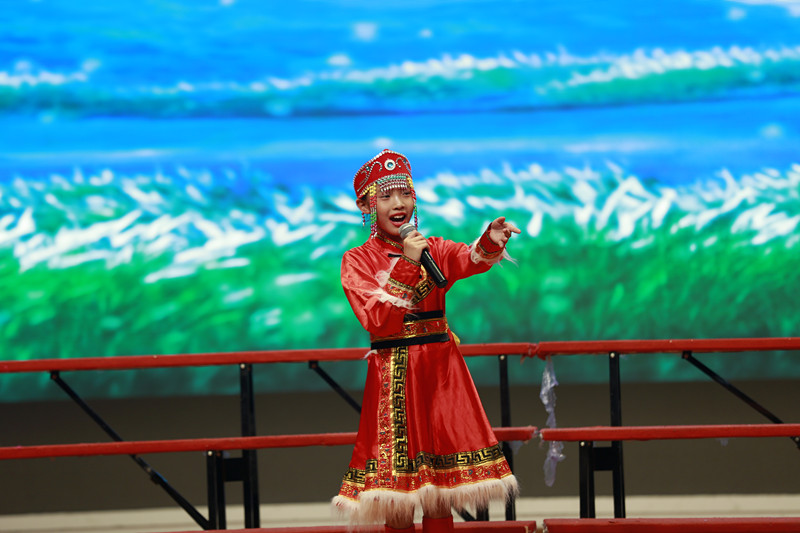 第五个节目是由四年(4)班张天勤同学演唱的《故乡的鸿嘎鲁》,歌曲是由内蒙古民歌《鸿雁》改编,张天勤用她婉转悠扬的声音展现了蒙古民歌的特点,打动了全场观众,掌声如潮。