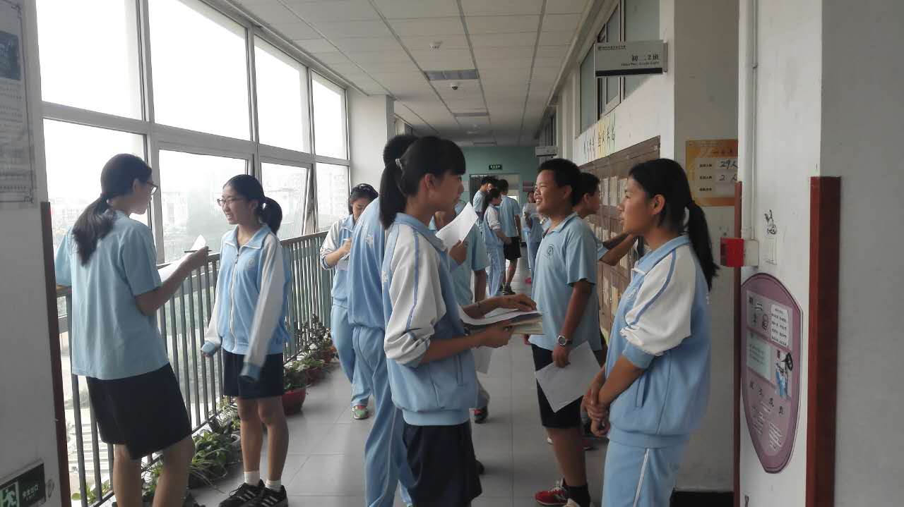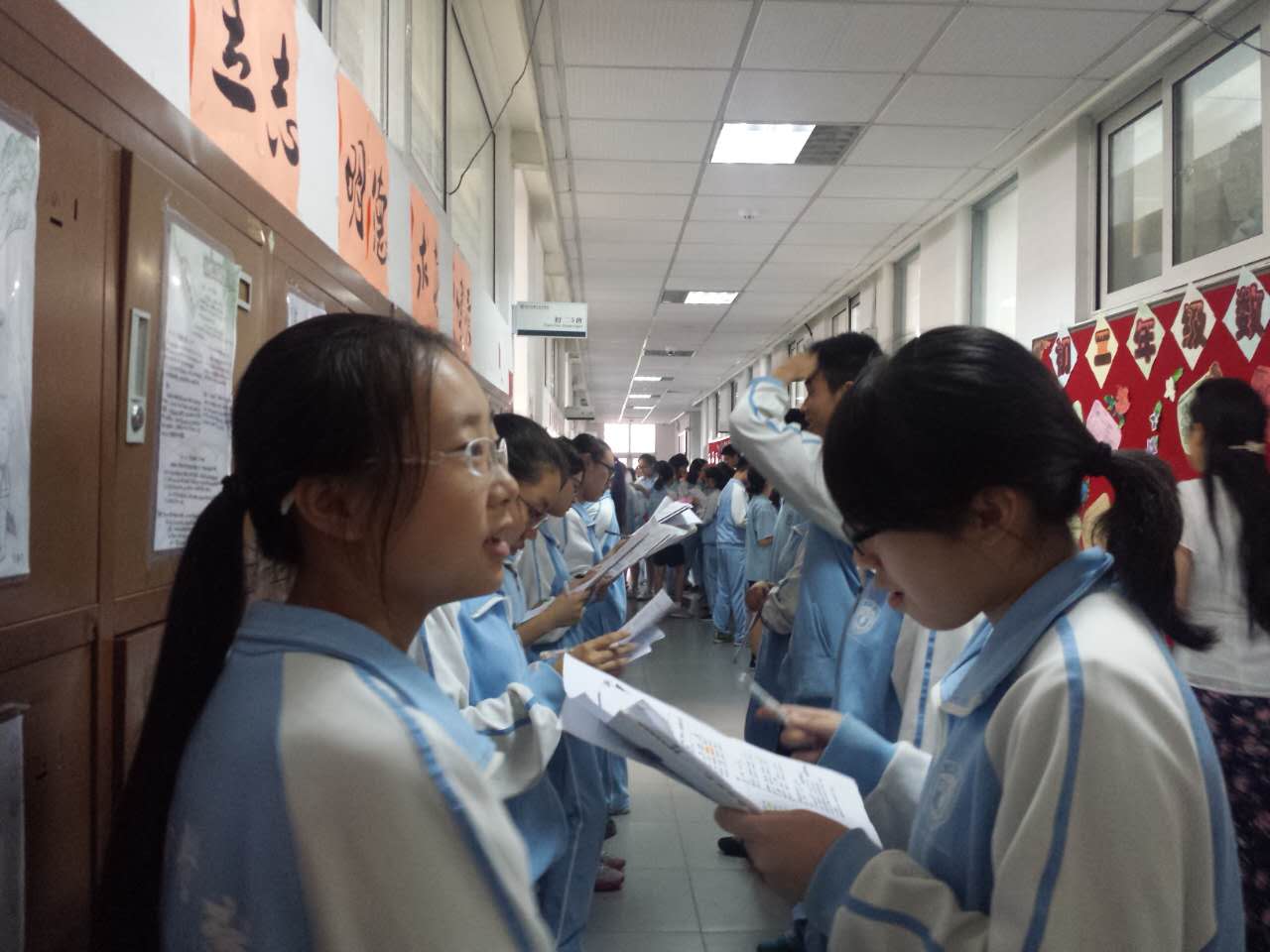 为了迎接比赛,准备工作于两周前就早早地开始了,老师们先制定了两次评比标准,各语文老师在检查班级背诵的基础上,分别选出6名背诵满分的同学做为检查员,负责检查各班背诵,年级对36名检查员进行了赛前的岗位培训,明确检查流程和纪律。检查当天,检测员提前到指定班级门口走廊,一字排开,各班被检查同学分别站在检查员面前,进行一对一的背诵检查。检查开始了,走廊里立时响起古诗词那特有的抑扬顿挫的旋律,检查的同学态度异常认真严肃,眼睛紧盯着原文,两耳仔细辨别任何一字的读音,及时记录分数;背诵的同学思维快速闪现,在记忆中搜寻那早已熟悉的文字,口吐莲花般将优美的古诗字字道出,脸上是自信的微笑,眼神里充满了自豪。一对对一排排,展现的是中学生继承传统的风采;一声声,一句句,飘荡的是古音古韵的绕梁余音。