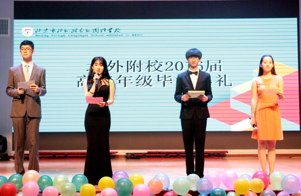 2016年6月21日,我校高三年级全体学生在国瑞厅隆重举行了《心怀感恩放飞梦想》毕业典礼。北京外国语大学校长助理、北外附校校长林卫民,北外附校党总支副书记、高中校区校长高雁鸣,初中校区校长张继军,小学校区校长于苒,北外附校校长助理、高中副校长王静,生活区主任李洪杰,出席了典礼仪式,高三年级全体教师和家长参加了此次活动。