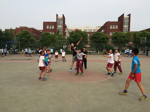 比赛双方是由葛红亮老师带队的篮球校队和李骏老师带队的六年级四班篮球队。