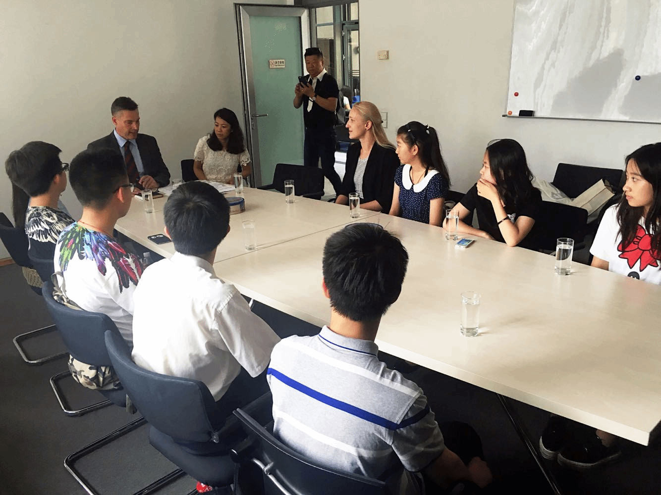 2016年5月30日,我校高中校区德语二级语言证书颁发仪式在德国驻华大使馆举行,德国驻华大使馆文化处处长Brandt先生、德国国外学校事务处专业顾问Wolfrum先生出席仪式并为我校学生颁发证书,我校德语外籍专家Hamann-Anetzberger女士、德语教师刘志欣、高二和高三年级德语班学生以及家长代表参加了仪式。