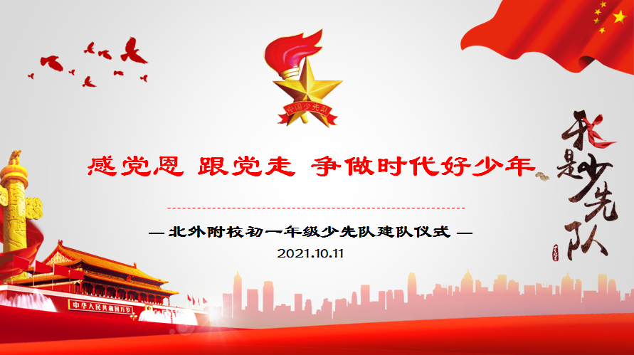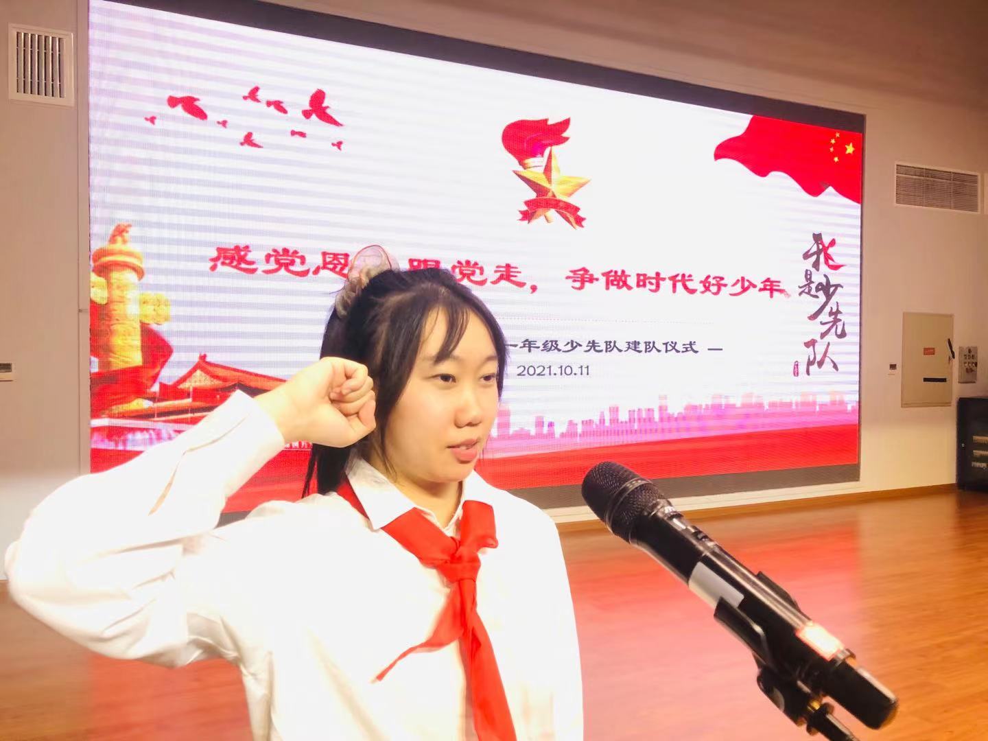 最后,大队辅导员杜梦瑶老师带领全体队员进行呼号“准备着:为共产主义事业而奋斗!”,“时刻准备着!”少先队员们的铮铮誓言响彻北外附校的校园。