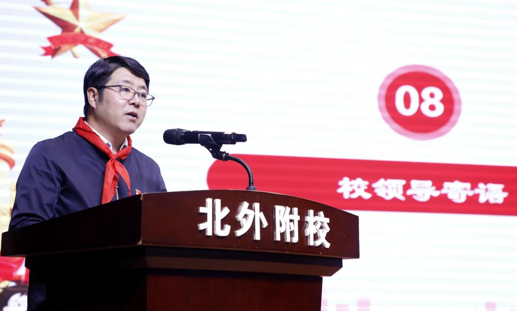 随后,杨磊为全体初一年级少先队联合中队的师生们献上寄语。杨磊首先向所有北外附校初一年级的新队员们以及辅导员老师们表达了祝贺,今年既是新中国成立72周年,也是中国少年先锋队建队72周年,72年砥砺奋进,中国少年先锋队这一光荣组织一直伴着新中国成长,与祖国同呼吸共命运。杨磊回顾了同学们入学以来的良好表现,同时提出了对中学时代少先队员更高的要求与希望。他用毛主席的诗词“自信人生二百年,会当击水三千里”勉励同学们要树立远大理想,努力学习知识本领,怀爱国之情,立报国之志,争取早日成为民族复兴大业的建设者和接班人。