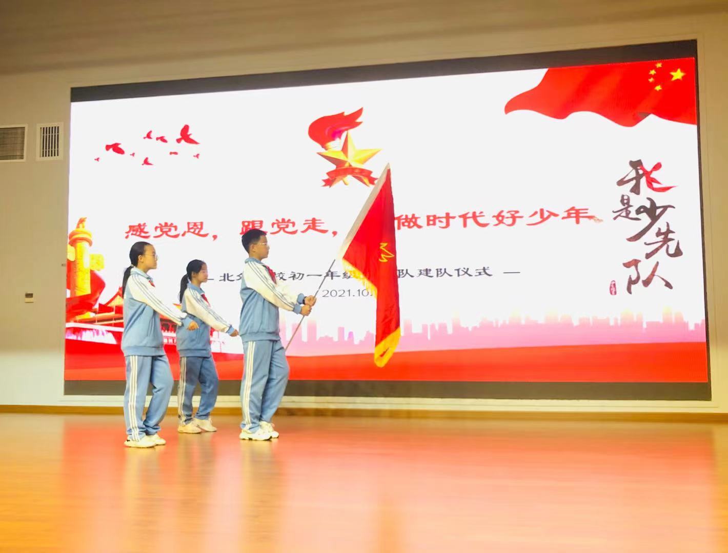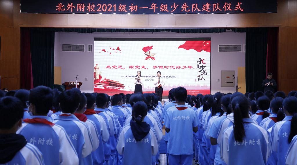 为庆祝中国少年先锋队建队72周年,深入贯彻习总书记在庆祝六一儿童节给全国广大少年儿童的寄语精神,促进我校少先队组织和谐发展,激励少先队员们继承和发扬少先队的光荣传统,增强学生使命感,10月11日下午,北外附校初一年级全体少先队员及各中队辅导员在国瑞厅隆重集会,举行主题为“感党恩 跟党走 争做时代好少年”的少先队建队仪式。副校长,初中校区校长杨磊、初中教导处主任王莉以及初一年级全体师生参加此次仪式。