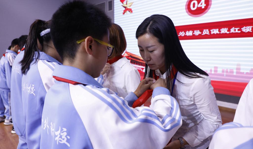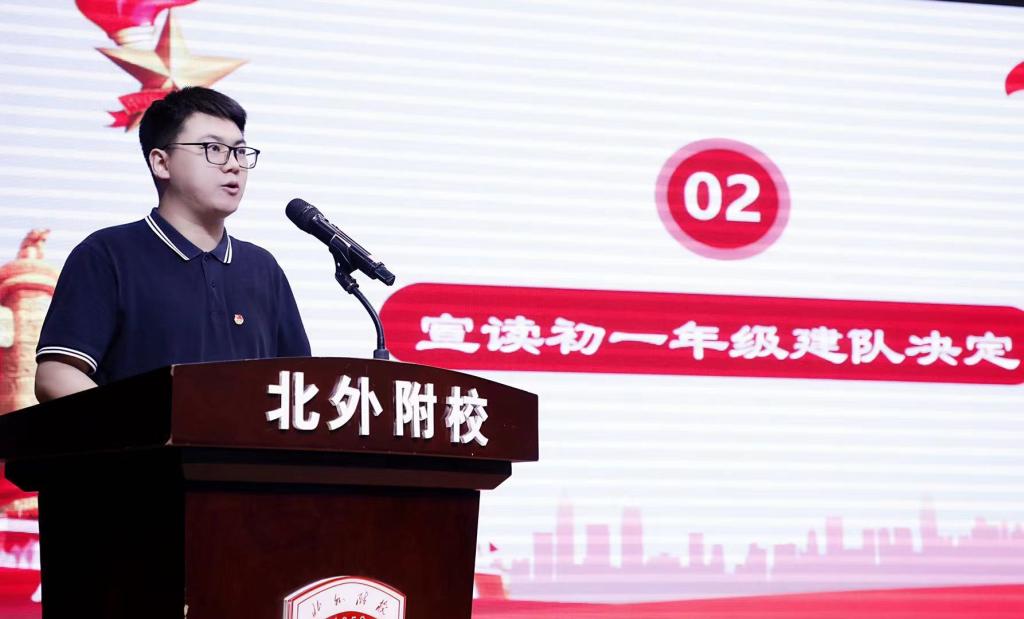 校团委书记潘铎轩老师代表校团委组织宣读了《关于建立北外附校初一年级中国少年先锋队的决定》并宣布了联合中队大队辅导员和各中队辅导员名单。