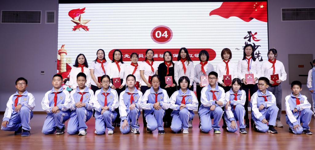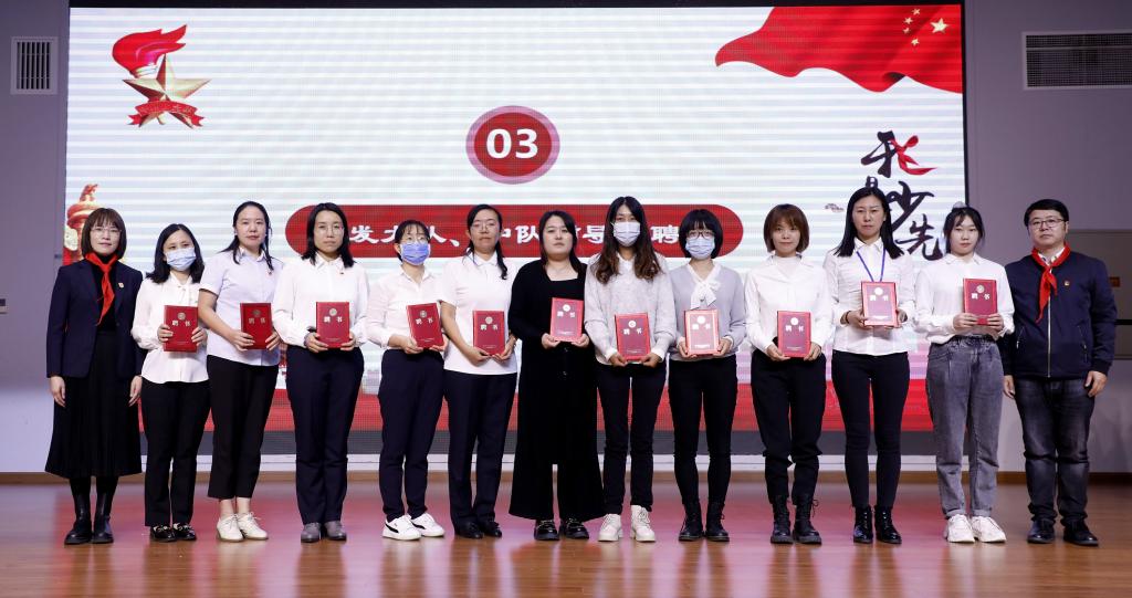 杨磊副校长和王莉主任为辅导员老师颁发聘书,从辅导员老师们坚毅的眼神中感受到了这份职责的使命感和责任感。接下来,各班少先队中队长为辅导员老师佩戴红领巾,向亲爱的老师们致敬。杨磊为各中队授中队旗,各中队中队长接旗并向全体少先队员展示。
