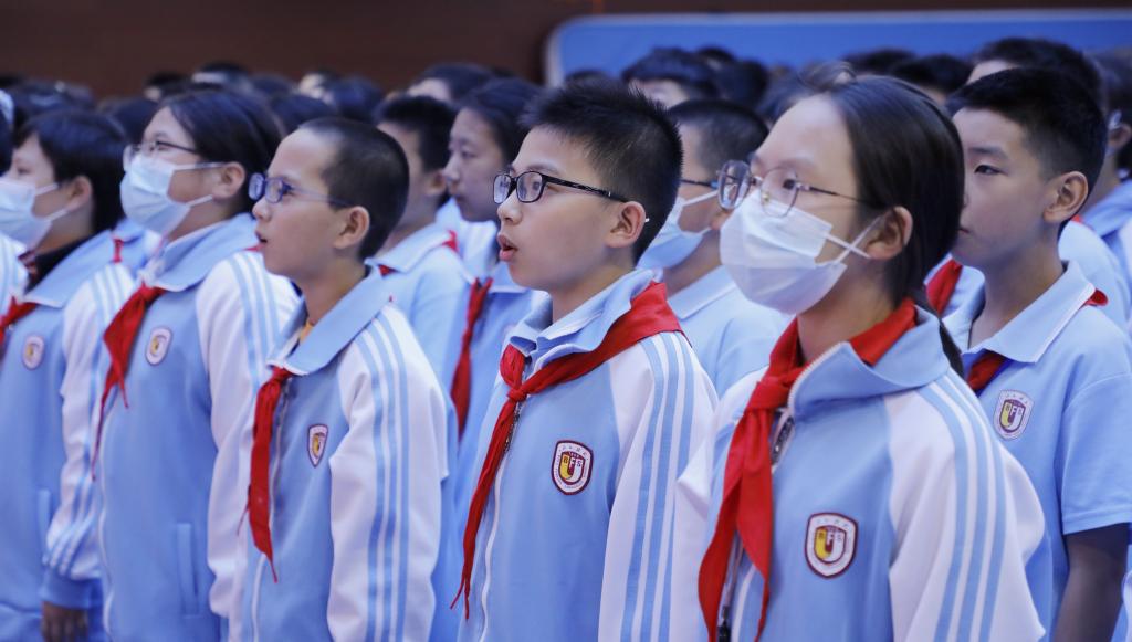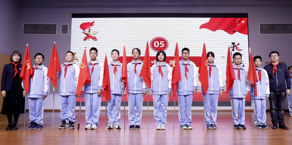 秋风送爽,队旗飞扬。全体少先队员庄严肃立,高声齐唱中国少年先锋队队歌:“不怕困难,不怕敌人,顽强学习,坚决斗争,向着胜利勇敢前进”。同学们嘹亮的歌声响彻校园。旗手们着装统一,动作规范,少先队员们歌声嘹亮、齐声铿锵,为仪式营造了庄重而又热烈的良好氛围。