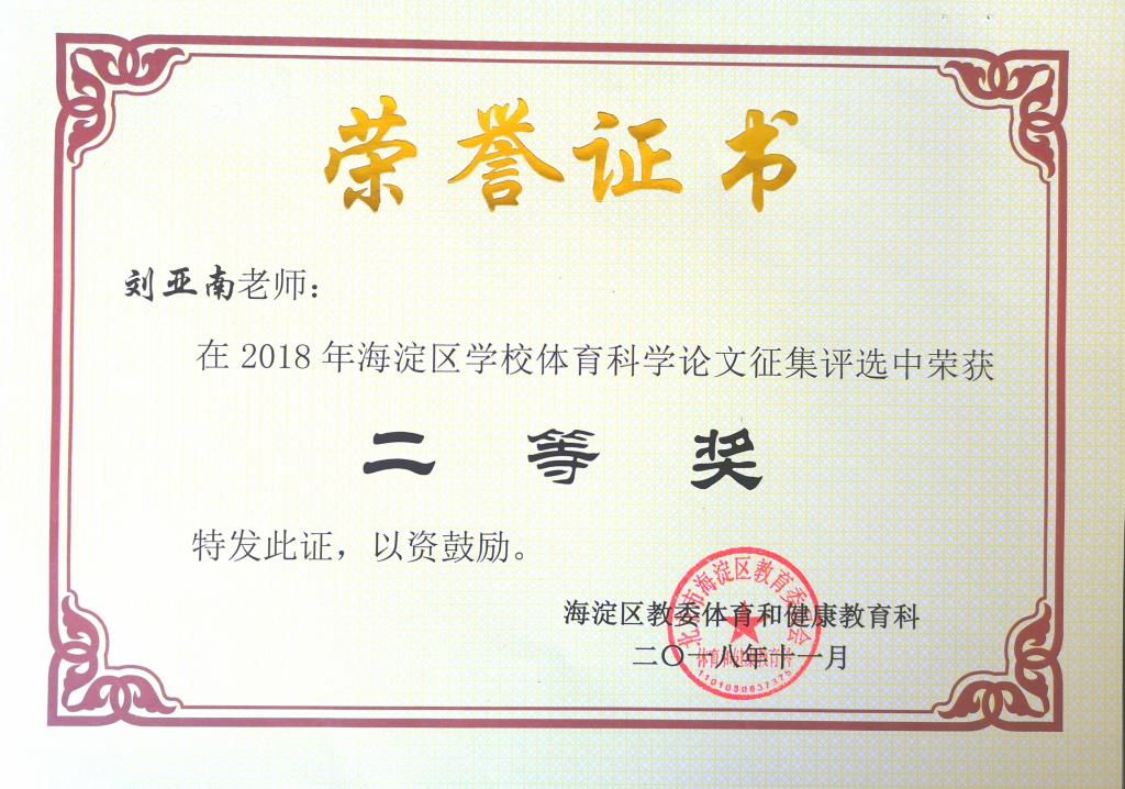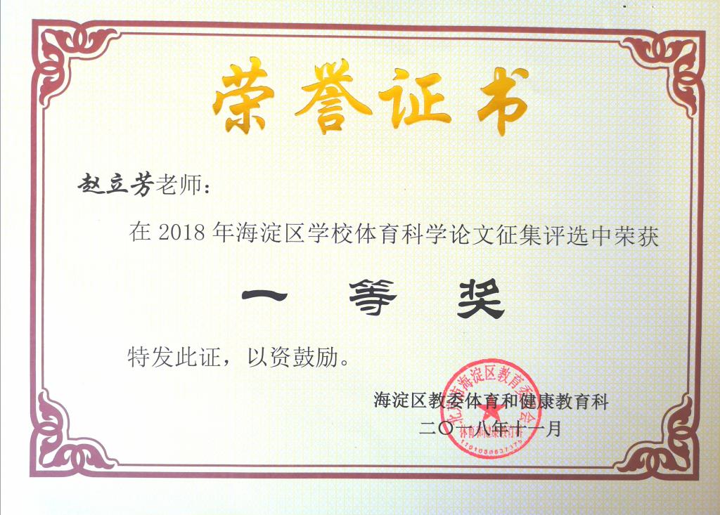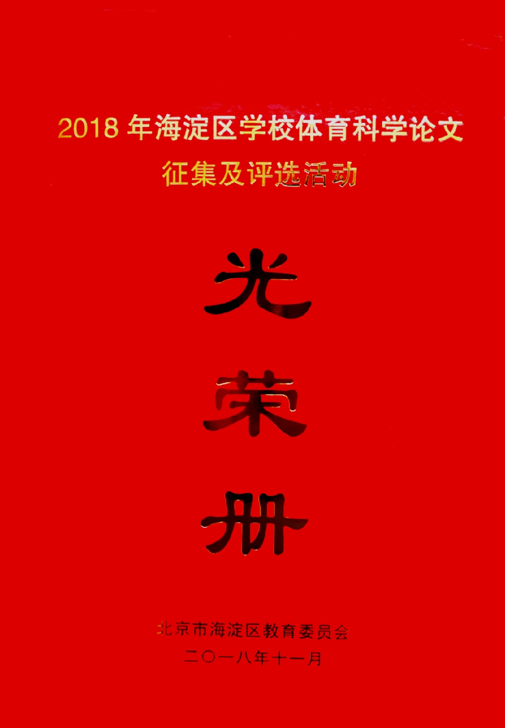 为贯彻落实市政府办公厅《关于加强学校体育促进学生身心健康全面发展的实施意见》(京政办发[2017]52号)精神,根据《北京市教育委员会关于开展 2018年学校体育科学论文报告会论文征集及评选工作的通知》的要求,区委于2018年7月——9月开展了“2018年海淀区学校体育科学论文征集及评选活动”。在此次论文征集评选的活动中,我校小学体育教师赵立芳老师撰写的《参赛视角下啦啦操校队的发展对策及方法探究》论文荣获一等奖;刘亚南老师撰写的《弘扬传统文化视角下的幼儿武术教育》论文荣获二等奖,两位教师喜获光荣册及获奖证书。