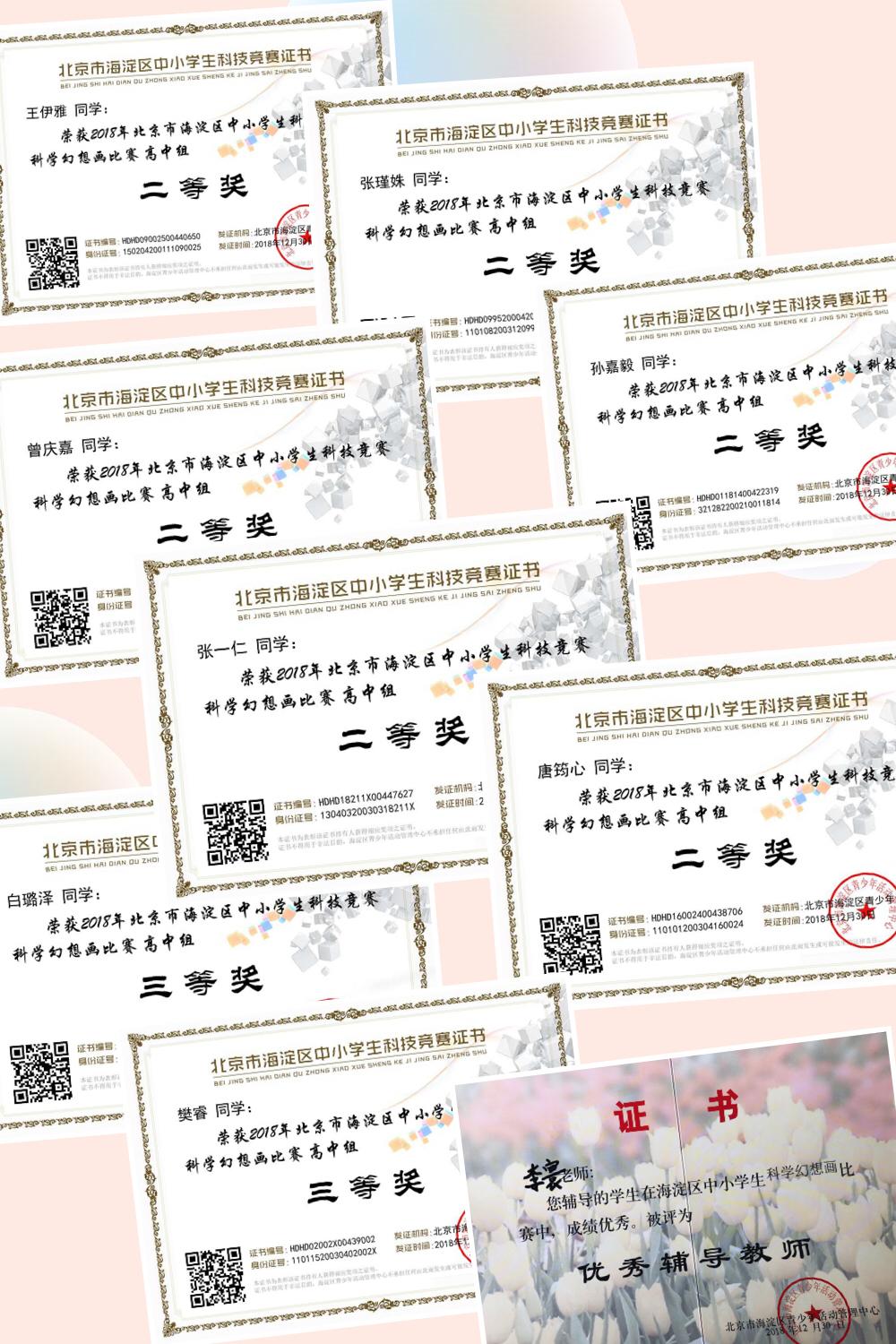 11月,我校高中学生在“北京市海淀区中小学生科学幻想画”比赛中,张瑾姝、孙嘉毅、唐筠心、曾庆嘉 、王伊雅、张一仁获得二等奖,白璐泽、樊睿、陈婧获得三等奖,李寰教师荣获优秀辅导教师奖。