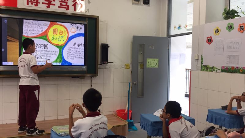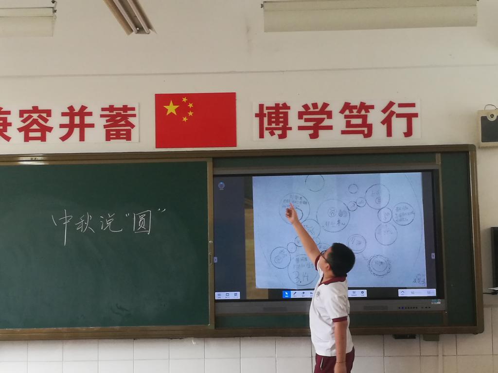 各中队主持人由中秋节的故事和图画提问的形式引入主题,启发队员们对圆的联想,有的中队在学习小组内分工合作,每位队员都积极创作自己组的作品,形式各样,色彩缤纷;有的中队则现场开展男女生PK战,比比“圆”的头脑风暴;有的中队准备了关于圆的PPT,主讲人自信展示,风采照人。